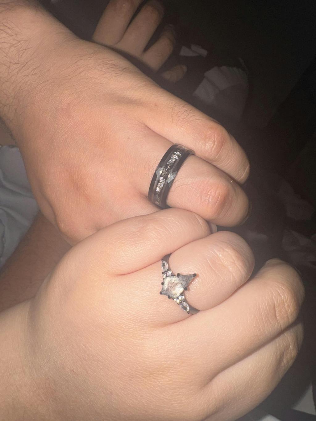 ► His Ring: Expertly crafted from tungsten carbide, his 8mm two-tone band showcases a rugged brushed black hammered finish complemented by a sleek silver-tone edge. The inlay features genuine meteorite fragments mixed with silver leaf — a symbol of a love that’s strong, rare, and infinite.