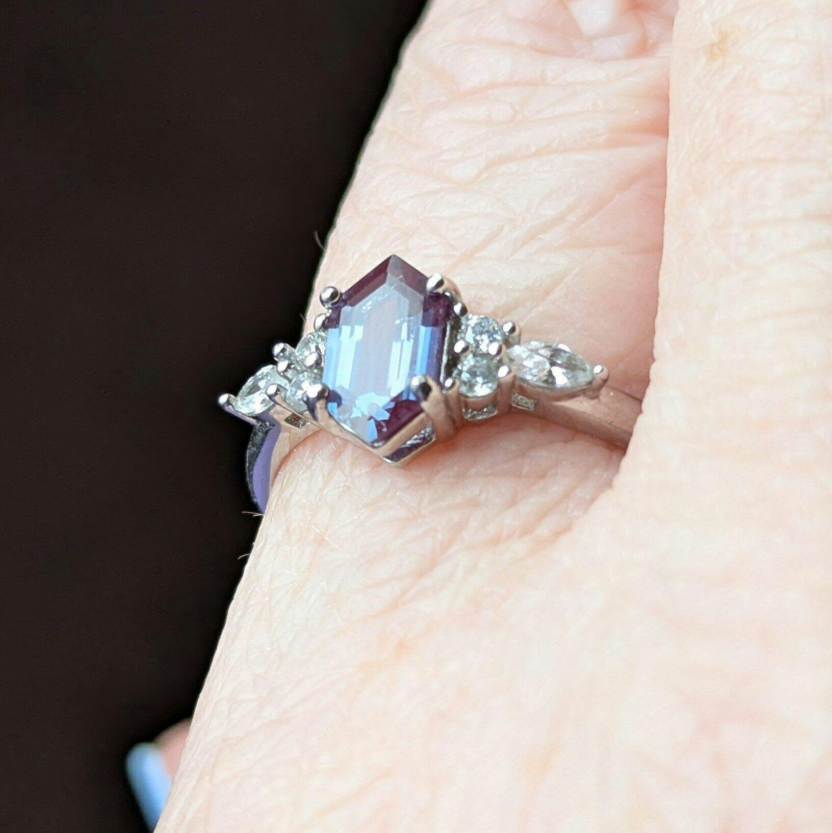 This gorgeous vintage-inspired alexandrite ring is crafted in 925 solid sterling silver, designed as a simple yet elegant statement piece. The unique hexagon-cut genuine lab-grown alexandrite takes center stage, accented by sparkling cubic zirconia for extra brilliance. Its timeless design makes it perfect as an engagement ring, promise ring, anniversary gift, or June birthstone ring.