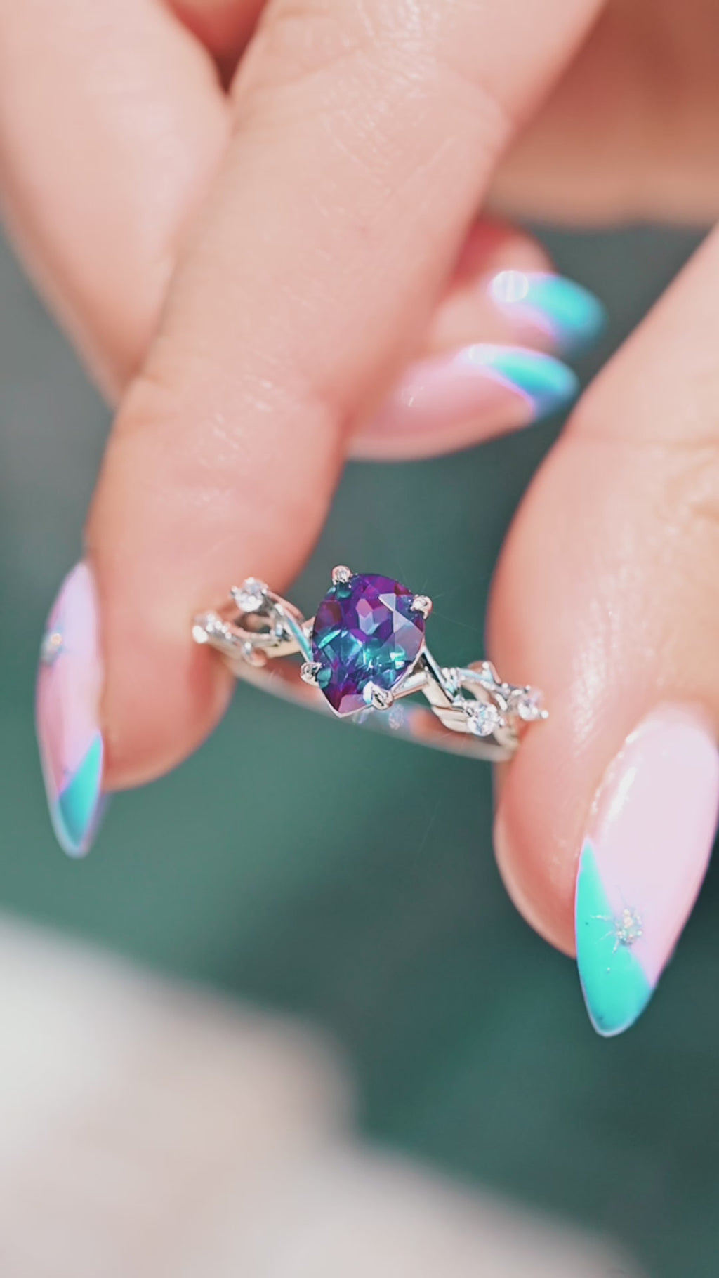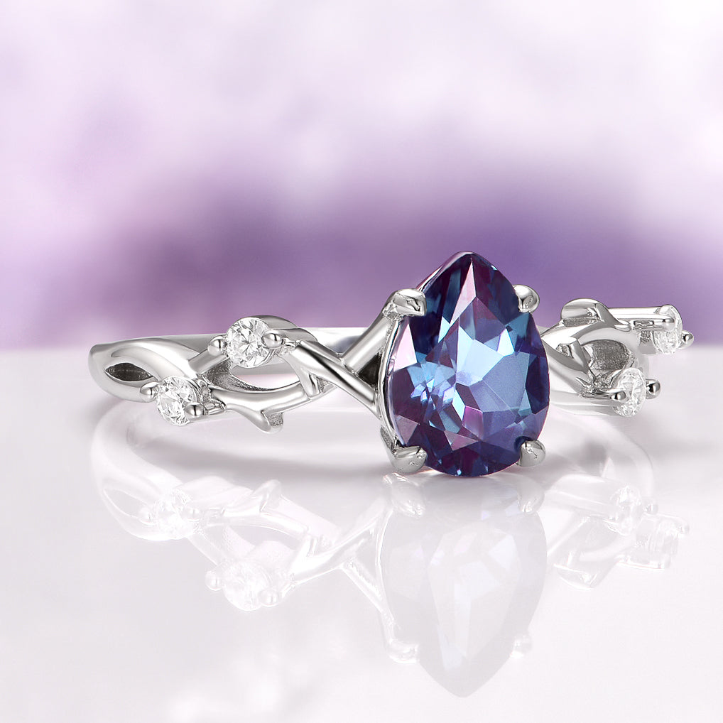 Introducing the exquisite Alexandrite Leaf Engagement Ring for Women, a captivating blend of timeless elegance and natural beauty. This enchanting ring showcases an intricate twig-inspired design crafted from 925 sterling silver, ensuring both durability and a stunning aesthetic. The teardrop-shaped centerpiece, adorned with a resplendent Alexandrite gem, captures the essence of romance and sophistication, making it an ideal choice for the discerning bride-to-be.