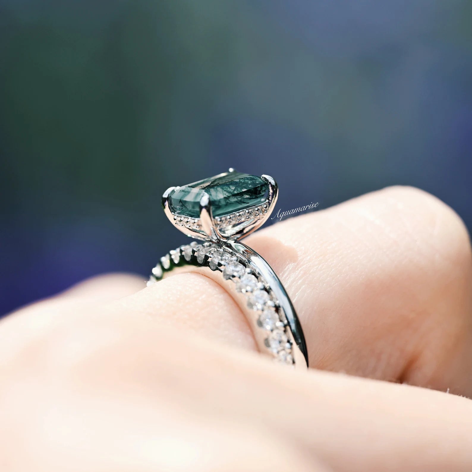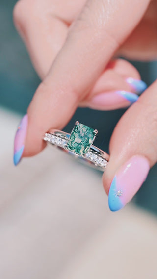 Emerald Cut Green Moss Agate Engagement Ring in Sterling Silver (Hidden Halo)
