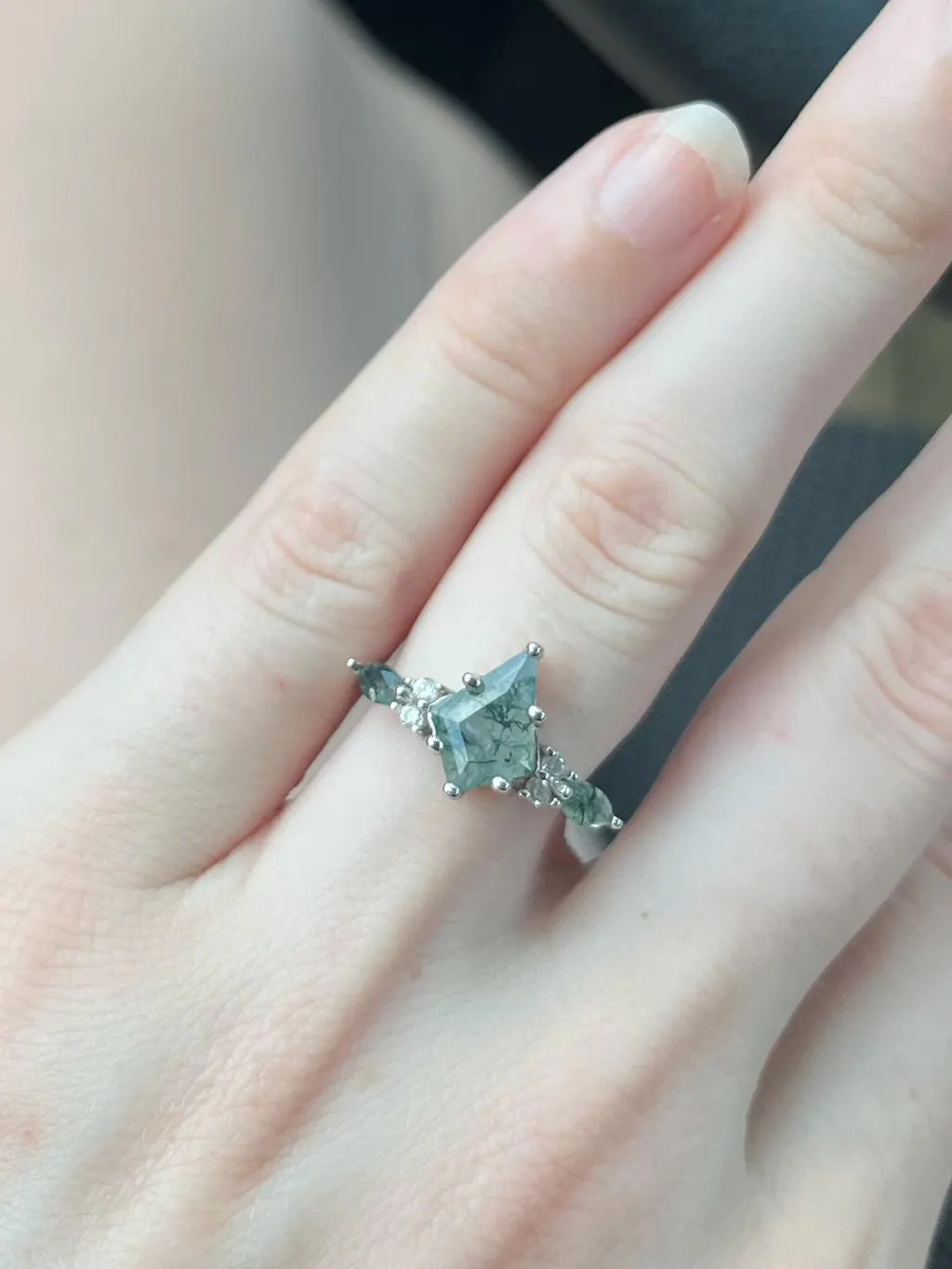 Symbolizing tranquility, balance, and growth, green moss agate is cherished for its soothing energy and connection to the earth. Its organic patterns are perfectly complemented by the luminous silver setting, creating a piece that feels both ethereal and timeless. Ideal for nature lovers, free spirits, and those who desire a meaningful alternative to traditional engagement styles.