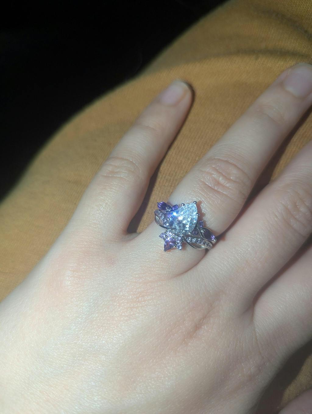 I adore this ring, and I get to see it every day as it's my engagement and wedding ring. It has a unique look that I admire- the silver styles with the graceful curves gives it a vintage feel with a fantasy aesthetic. The purple and silver really reflect myself and my husband saw that too. He even had "My Eternal Boo" engraved inside. The lettering is very small but well done and always a wonderful reminder. Since I wanted the sterling silver ring, there may be future upkeep but I'm so happy with it. I will always love it for the rest of my life and marriage. Thank you!!