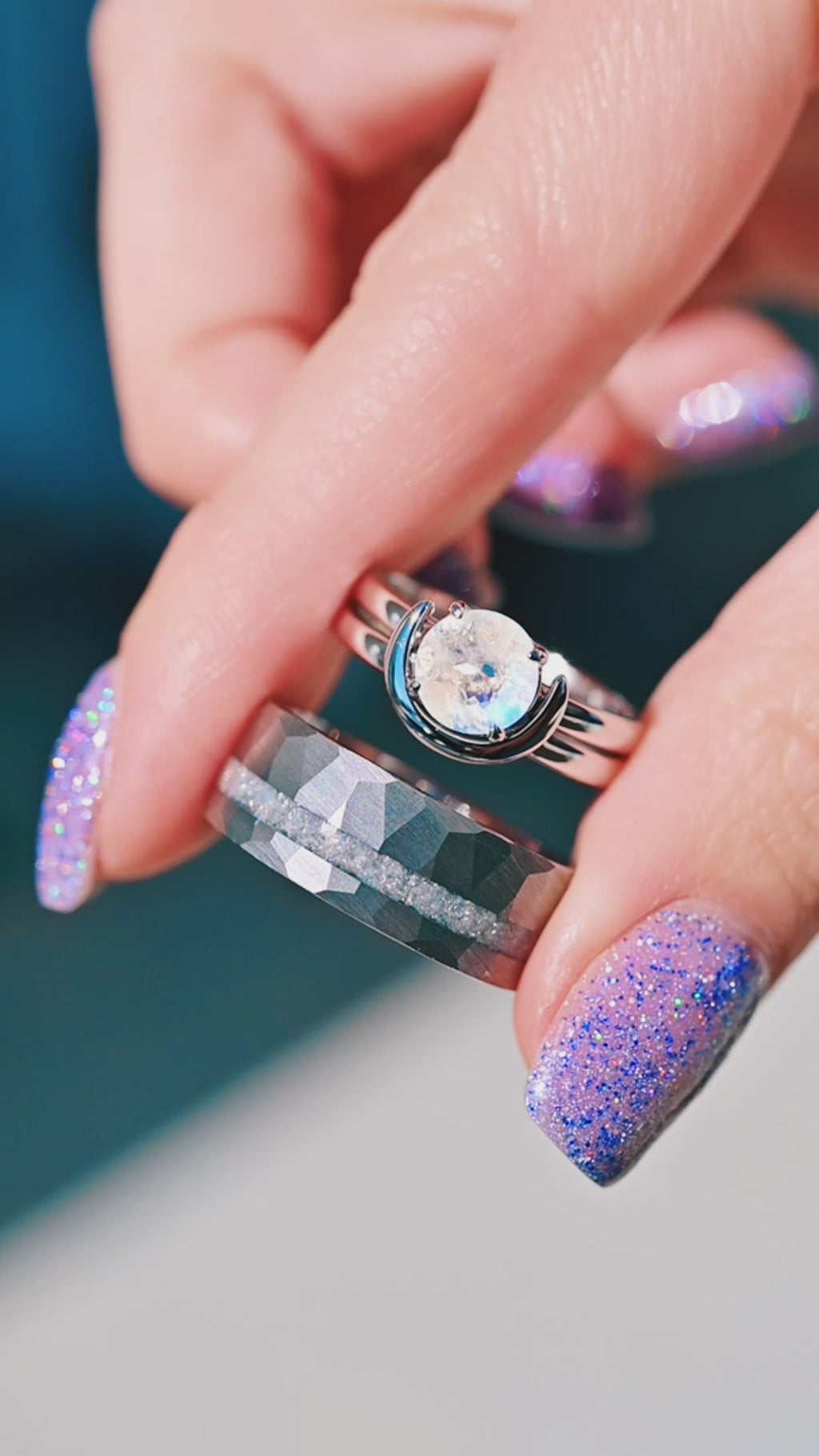 This set is GORGEOUS and far exceeded my expectations. The flash in the moonstone is beautiful, the stone is substantial, and the fit is perfect! My fiancé and I both have large hands and this set accommodated the sizes that we needed. Shipping was super fast. I could not be happier with this set!!!