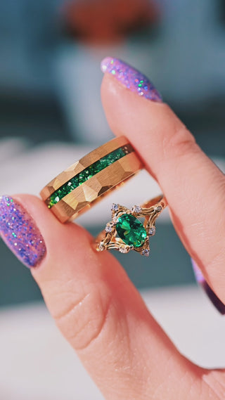 A striking blend of natural allure and modern craftsmanship, this Crushed Emerald Men’s Wedding Band captures strength, elegance, and individuality. The 8mm tungsten carbide band with a gold finish features a brushed, hammered texture that radiates understated sophistication—crafted for the modern gentleman who values both style and substance.