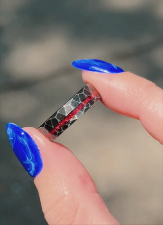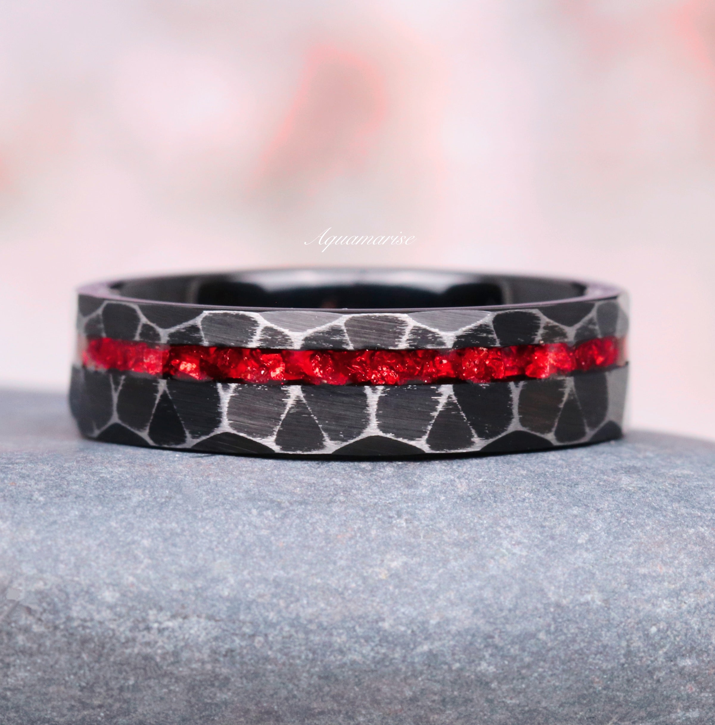 Crushed Red Garnet Black Tungsten Men's Wedding Band, a masterpiece of craftsmanship and style that redefines the essence of contemporary elegance. Crafted from high-quality Tungsten Carbide, this 6mm hammered ring represents the perfect fusion of strength and sophistication.