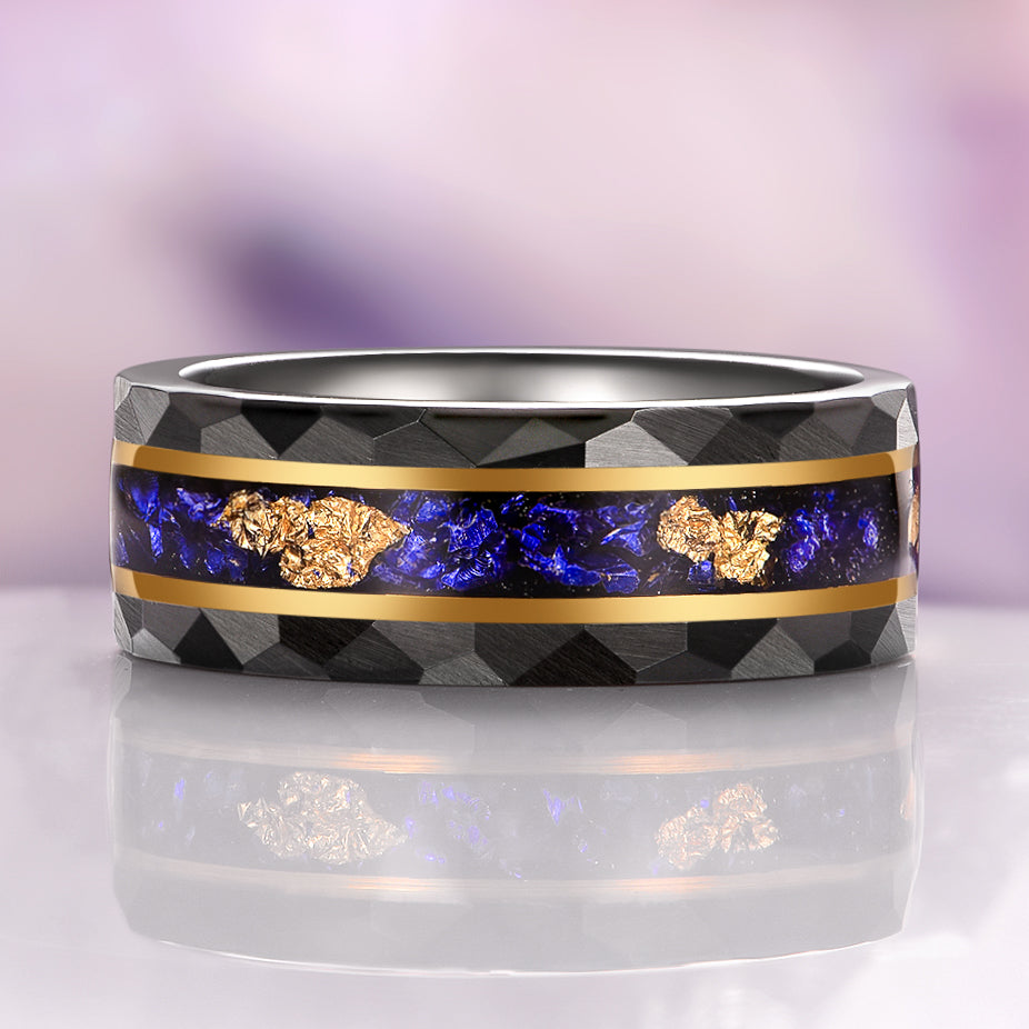 Blue Sapphire & Gold Leaf Hammered Wedding Band in Black Tungsten Carbide (8mm)