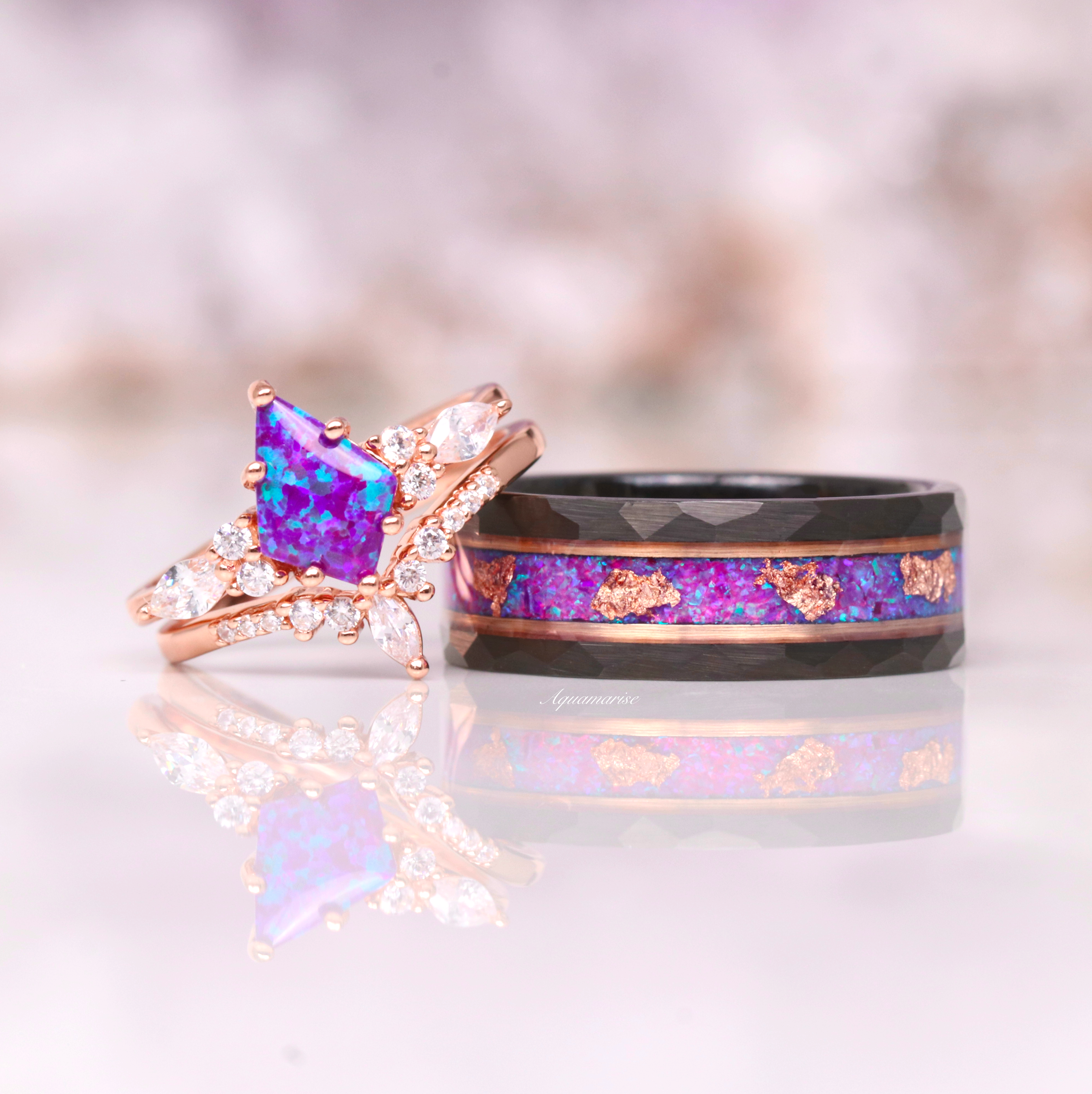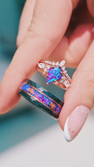 Introducing our exquisite His and Hers Tungsten Wedding Band, a symbol of everlasting love crafted with precision and style. This stunning 8mm ring features a captivating combination of Purple Opal and Rose Gold Leaf inlays, creating a mesmerizing visual appeal. The band is made from durable Black Tungsten Carbide material, ensuring longevity and resilience.