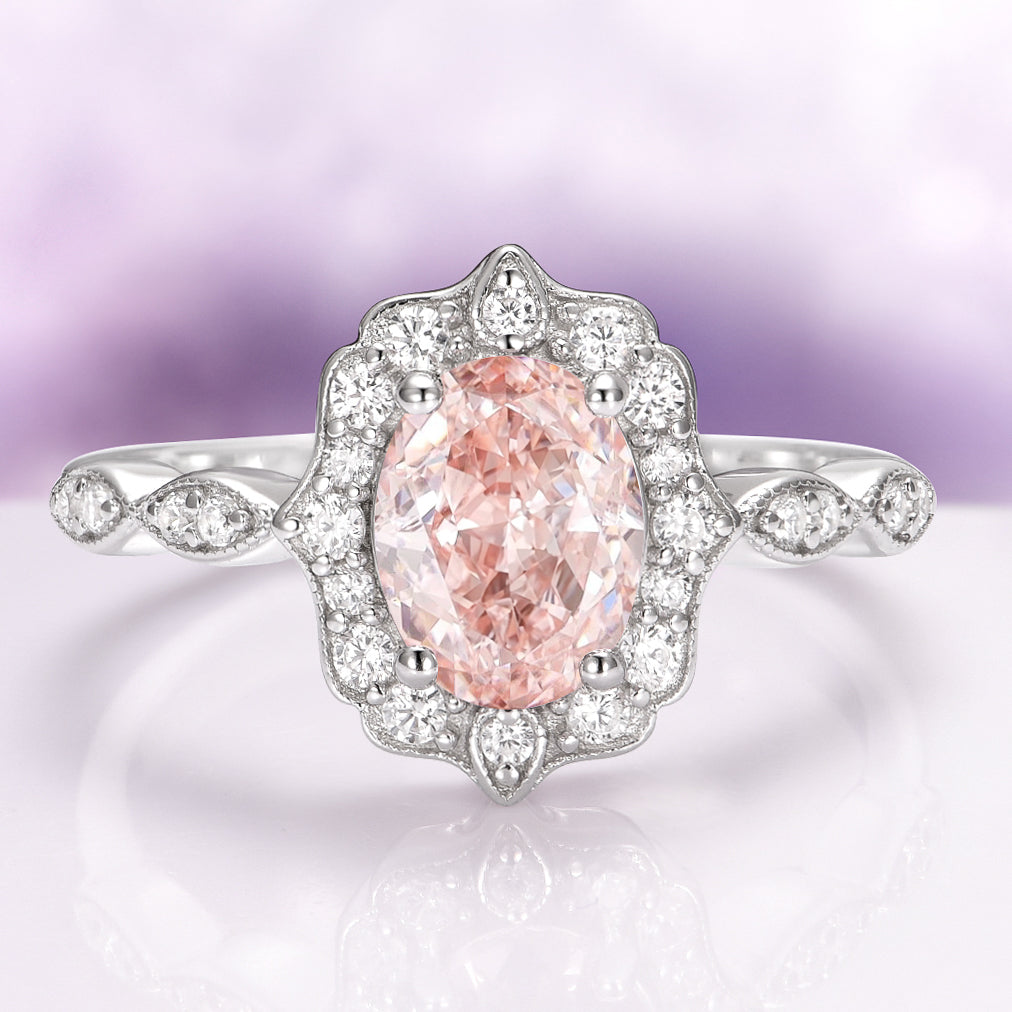 Timeless and romantic, this Vintage Morganite Ring in 14K solid white gold blends antique charm with soft elegance. An oval-cut peach-pink morganite sits at the center, radiating warmth and compassion. Framed by sparkling moissanite accent stones in a vintage-inspired setting, this ring captures the beauty of enduring love, perfect for romantic souls and lovers of delicate, nature-inspired design.