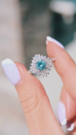 Introducing the Joelle Vintage Aquamarine Engagement Ring, a graceful design that blends timeless elegance with romantic charm. Handcrafted in solid 14K white gold, this enchanting ring features a brilliant round-cut natural aquamarine, admired for its serene blue hue that symbolizes clarity, harmony, and devotion. A vintage-inspired setting with delicate detailing frames the aquamarine, while your choice of moissanite or natural diamond accent stones adds a touch of sparkle. Paired with the luminous white gold band, this ring is a beautiful expression of love designed to be cherished for generations.