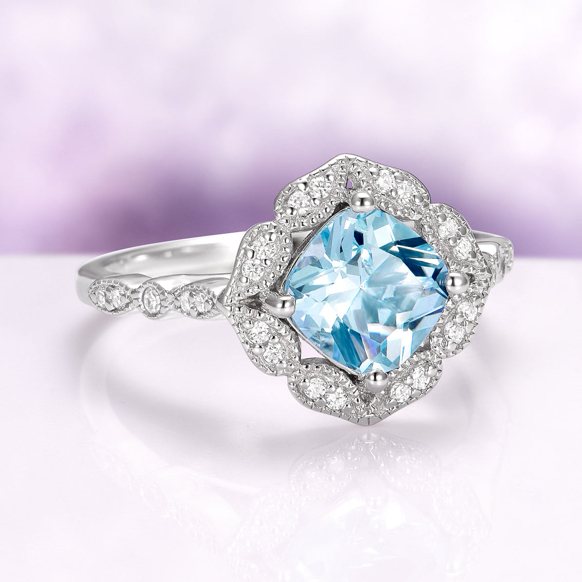 Elegant and timeless, this Cushion Aquamarine Engagement Ring is crafted in solid 925 sterling silver and features a soft blue gemstone in a vintage-inspired Art Deco setting. The delicate cushion-cut aquamarine shines with subtle brilliance, making it the perfect choice for an engagement ring, promise ring, or March birthstone jewelry gift for her. With its romantic detailing and refined design, this aquamarine ring is ideal for anniversaries, birthdays, or as a meaningful everyday accessory.