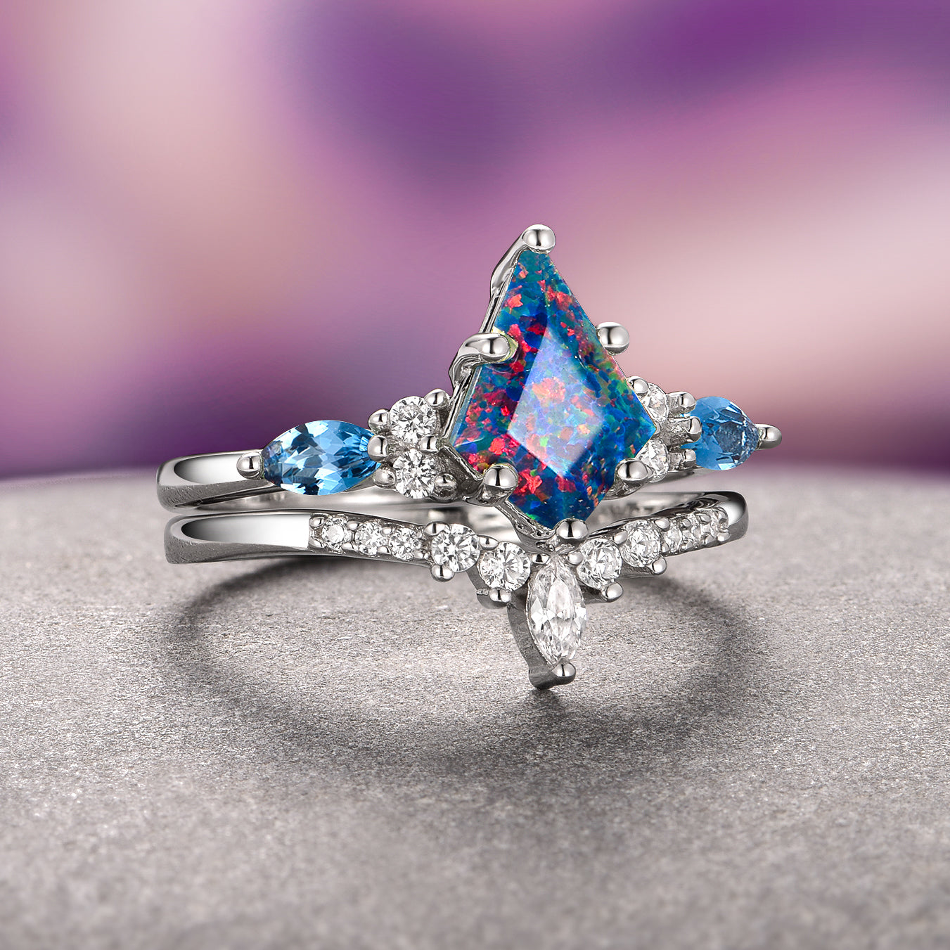 Make a bold statement with our Skye Kite™ Blue Fire Opal & Topaz Engagement Ring Set, a one-of-a-kind design that captures the magic of the sky and stars. Handcrafted in solid 14K white gold, this stunning set features a kite-shaped lab-created blue fire opal that shimmers with celestial hues of teal, indigo, and icy blue.