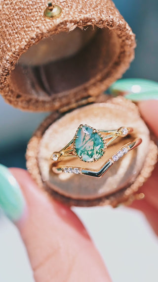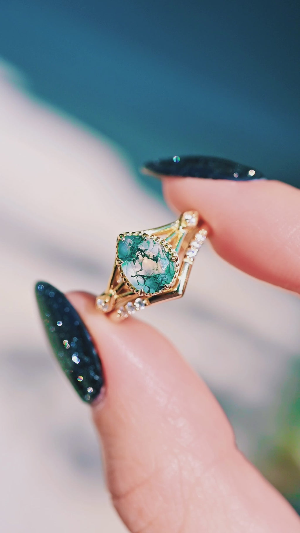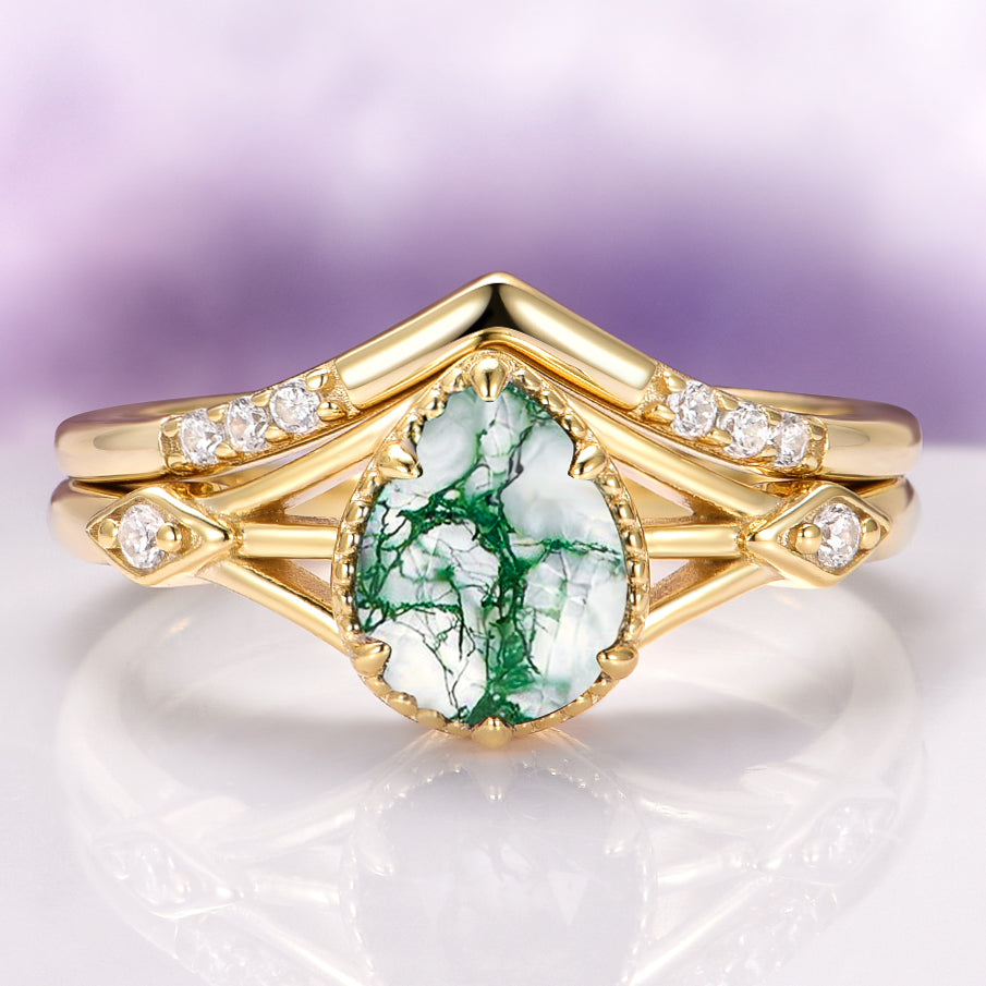 Celtic Teardrop Green Moss Agate Ring Set in 14K Yellow Gold Vermeil