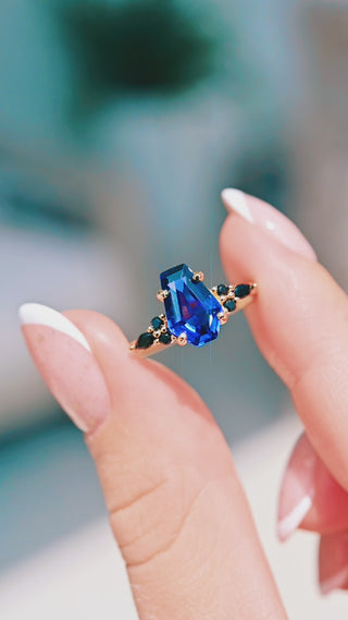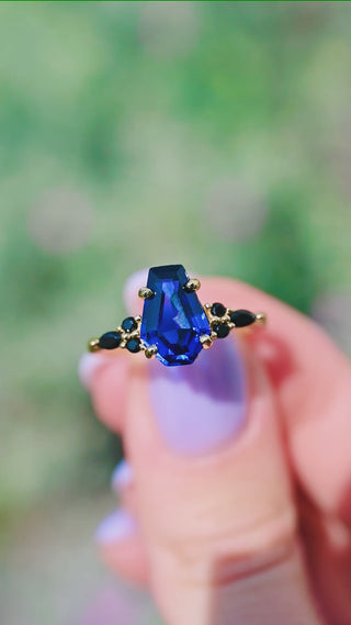 Introducing our Coffin Cut Blue Sapphire & Black Diamond Ring, a captivating and edgy expression of love and commitment. This unique engagement ring is crafted with precision from 14K Yellow Gold Vermeil , ensuring a sleek and contemporary aesthetic that stands out from the ordinary.