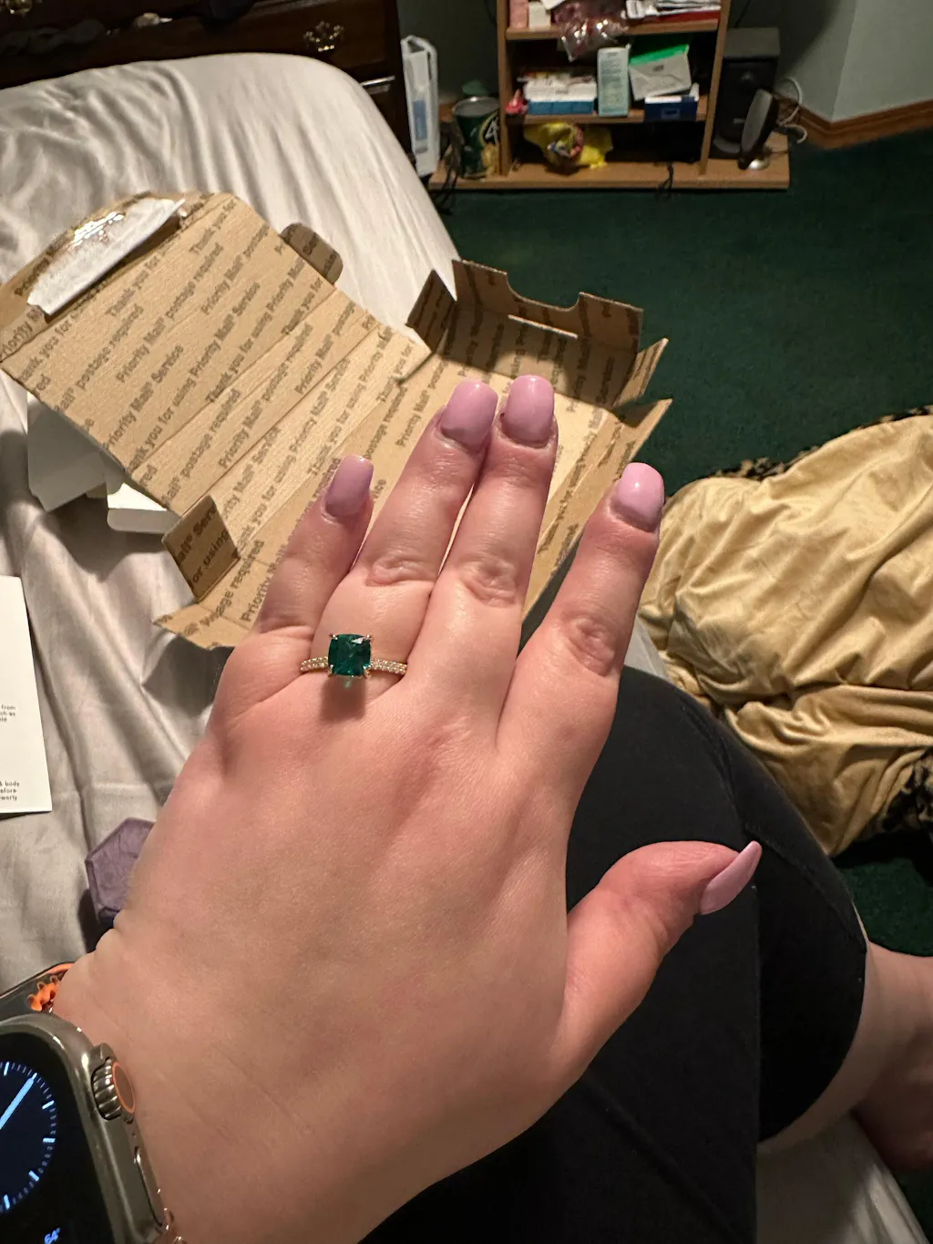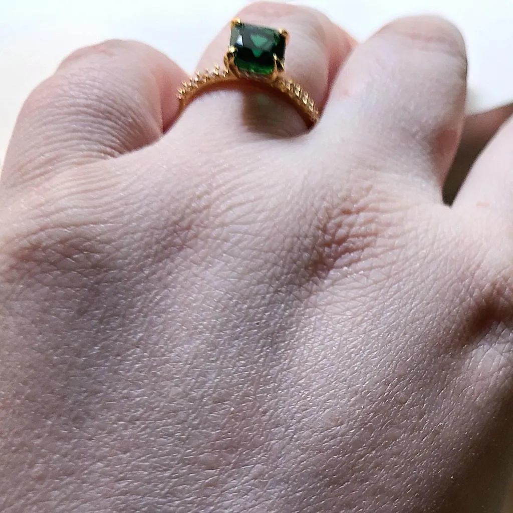 IThe green color is illuminating, nothing flat or too dark. The setting is unique and "royal".