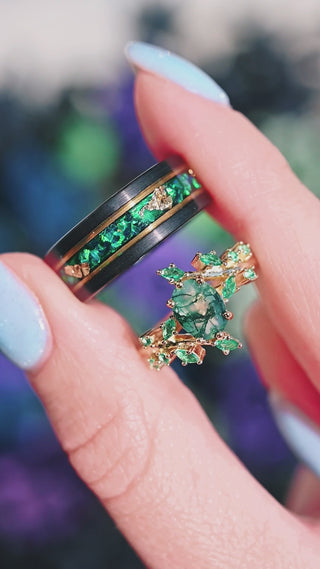 Green Moss Agate & Emerald Leaf Ring in 14K Yellow Gold Vermeil