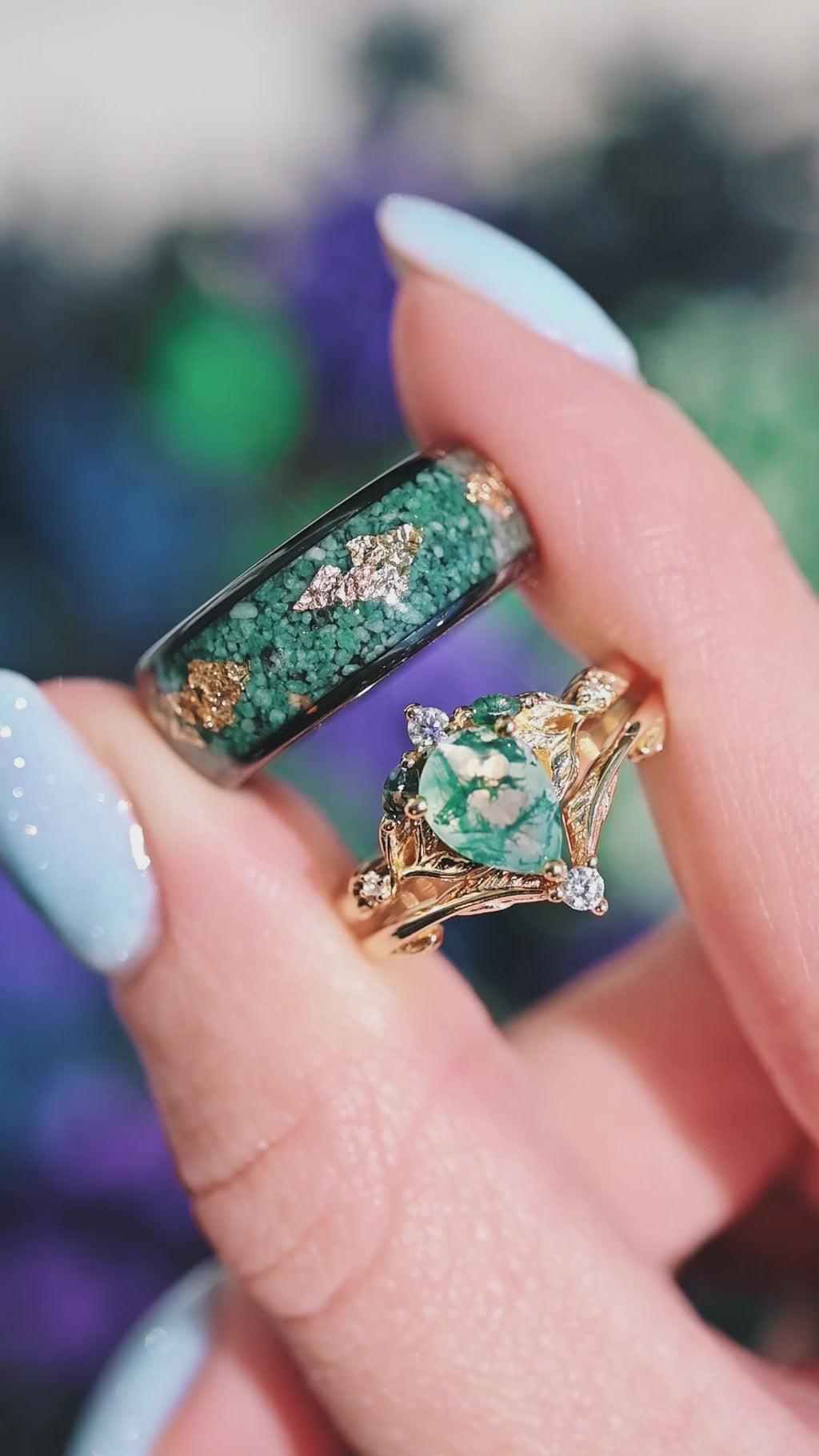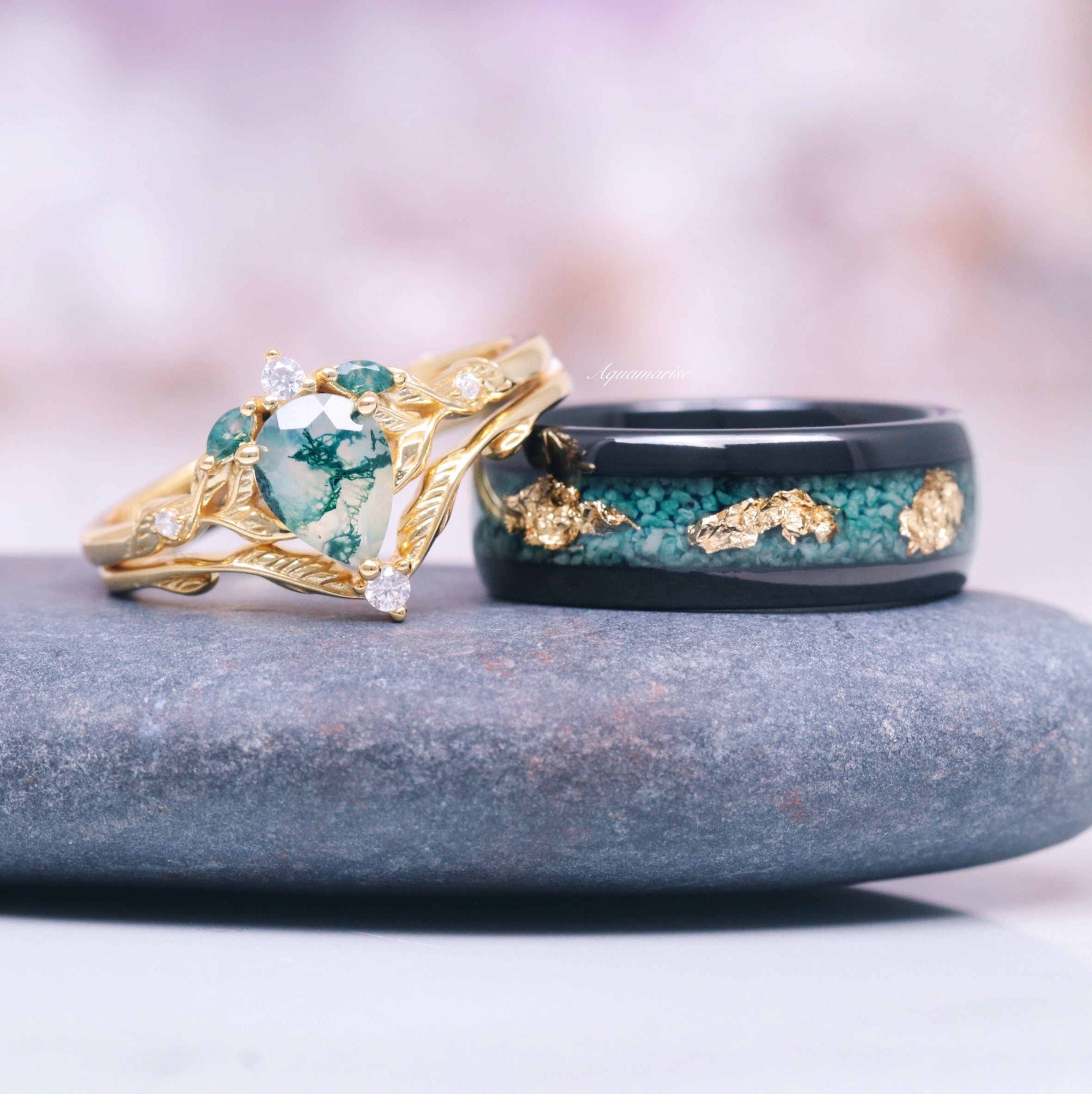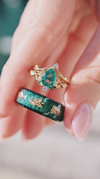 Green Moss Agate Leaf Engagement Ring in 14K Yellow Gold Vermeil