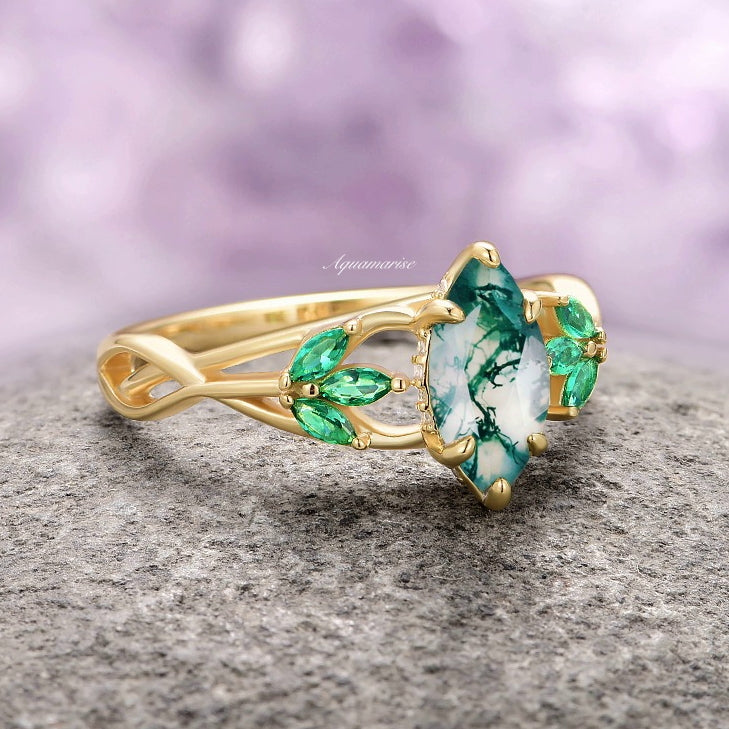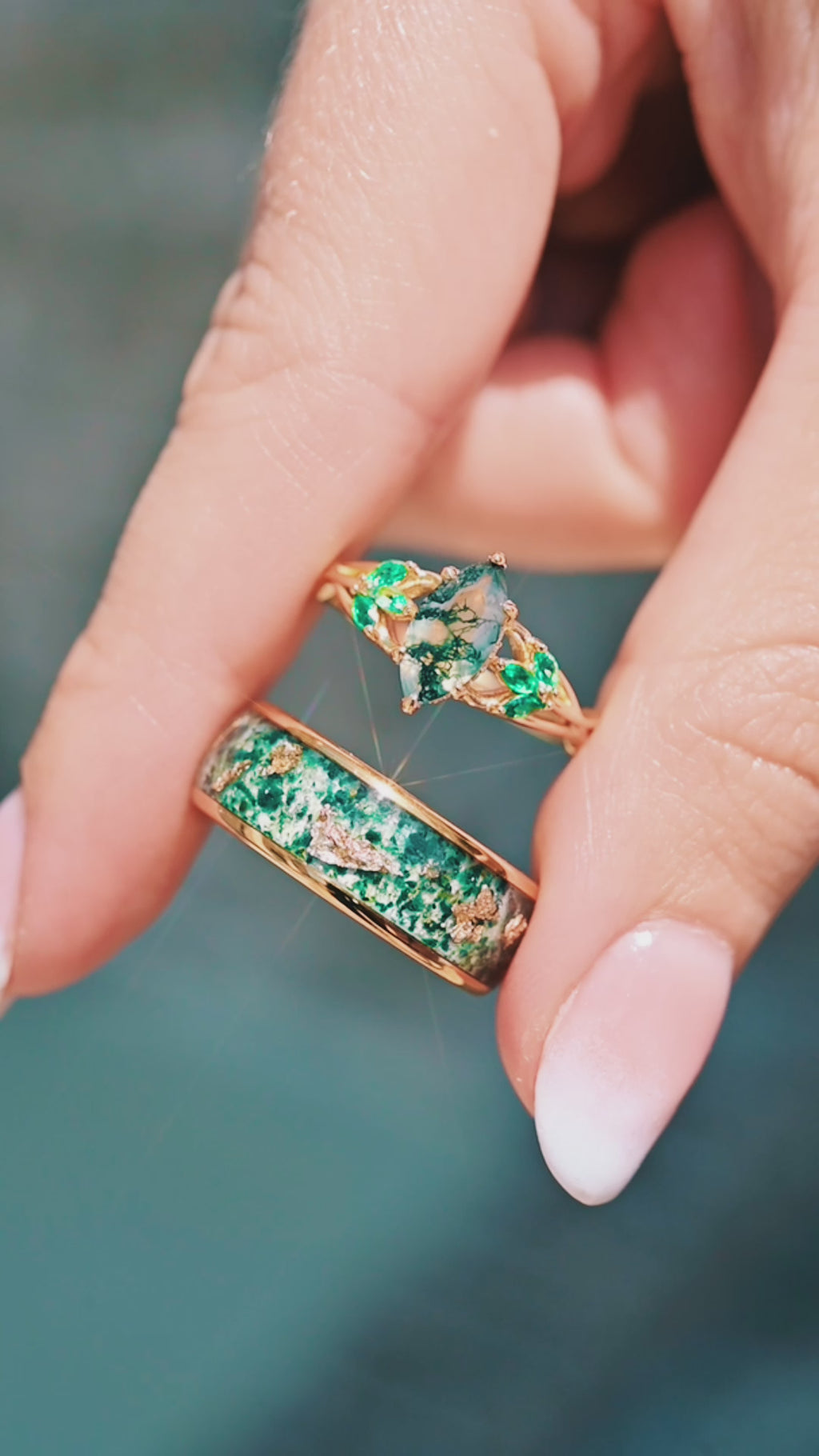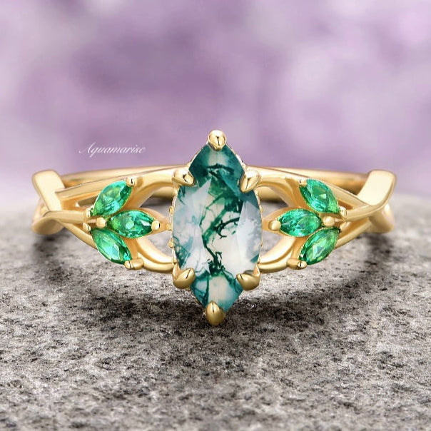 ►Gift her a touch of magic with this unforgettable nature-inspired Moss Agate and Emerald Engagement Ring—a symbol of eternal love and growth.