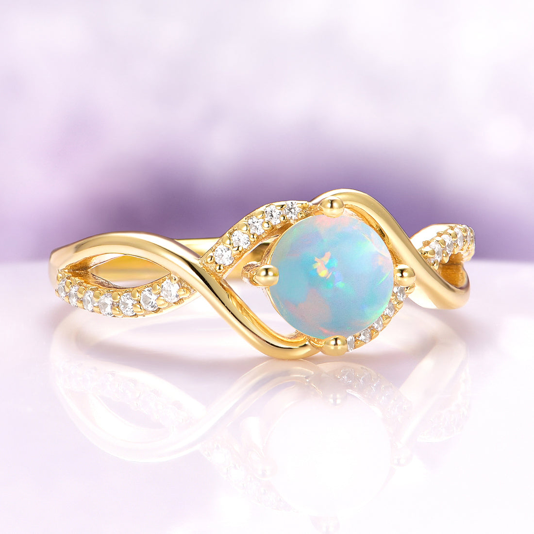 The opal, celebrated as October’s birthstone, symbolizes hope, purity, and truth. Ancient legends speak of opals as stones of prophecy and divine light. Each gem is unique, displaying shifting hues from subtle pastels to a rainbow of colors, ensuring that every ring is one of a kind.