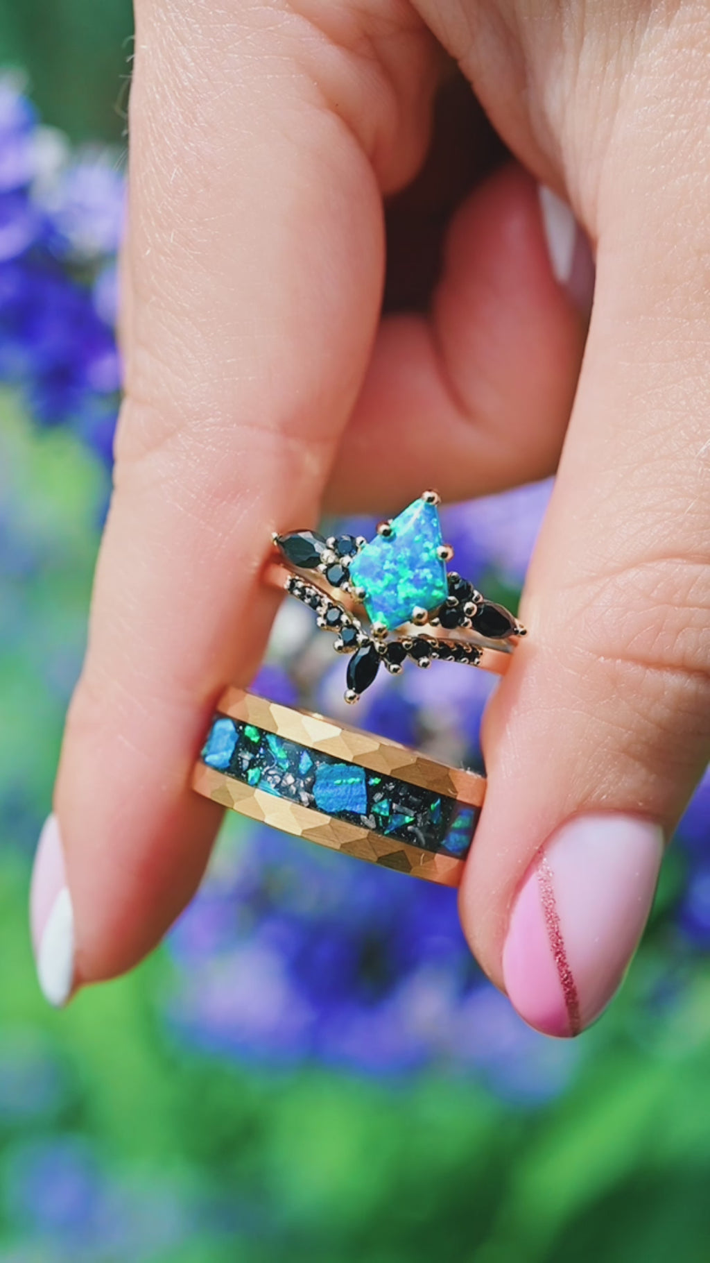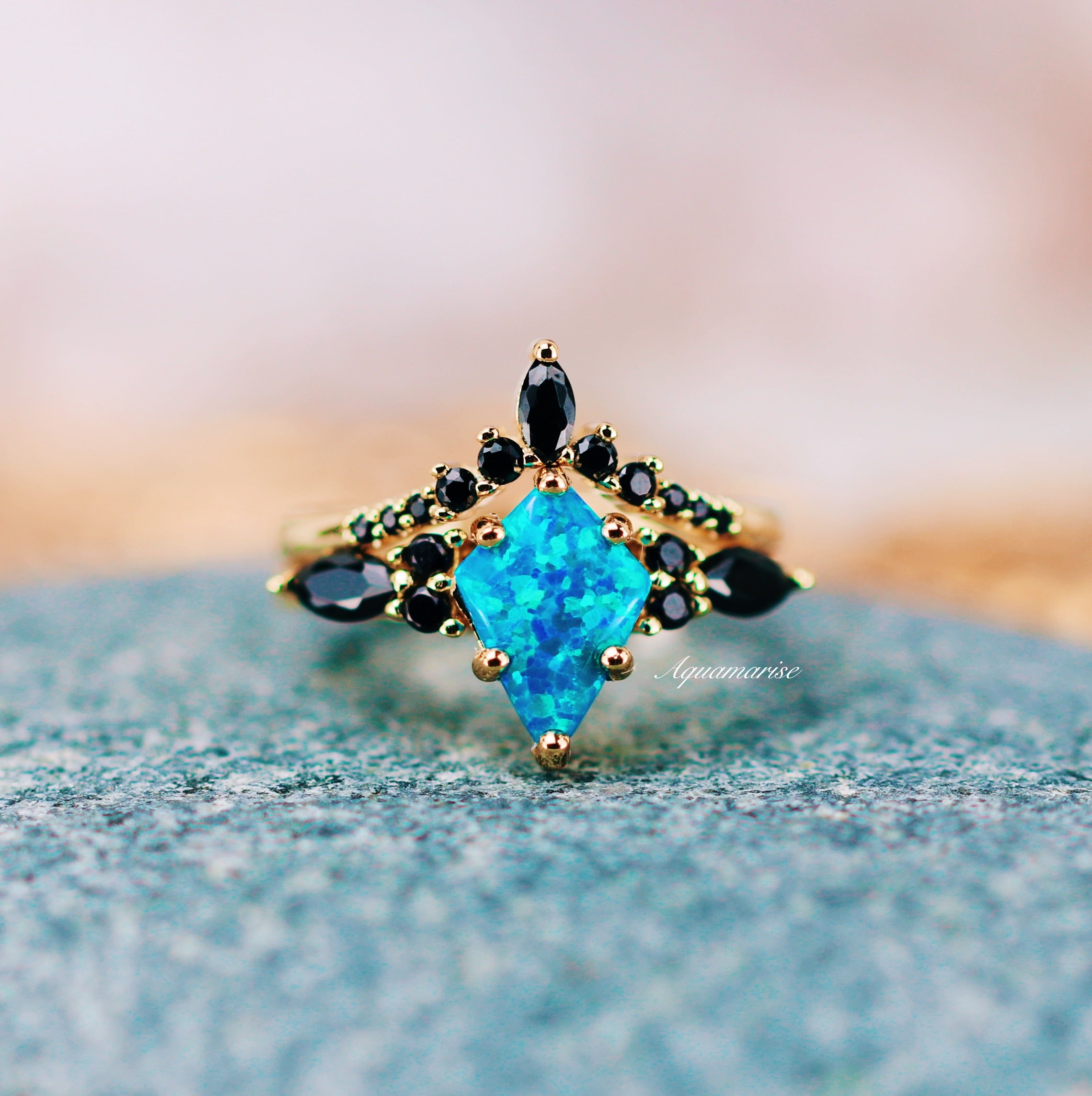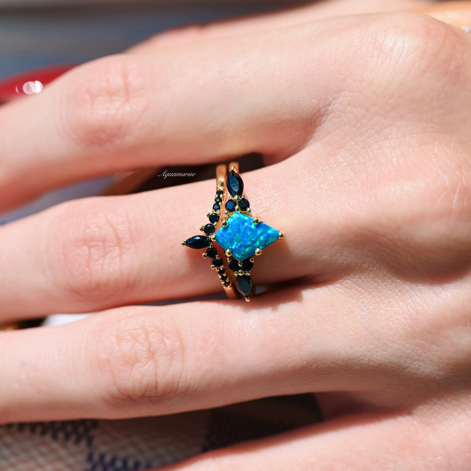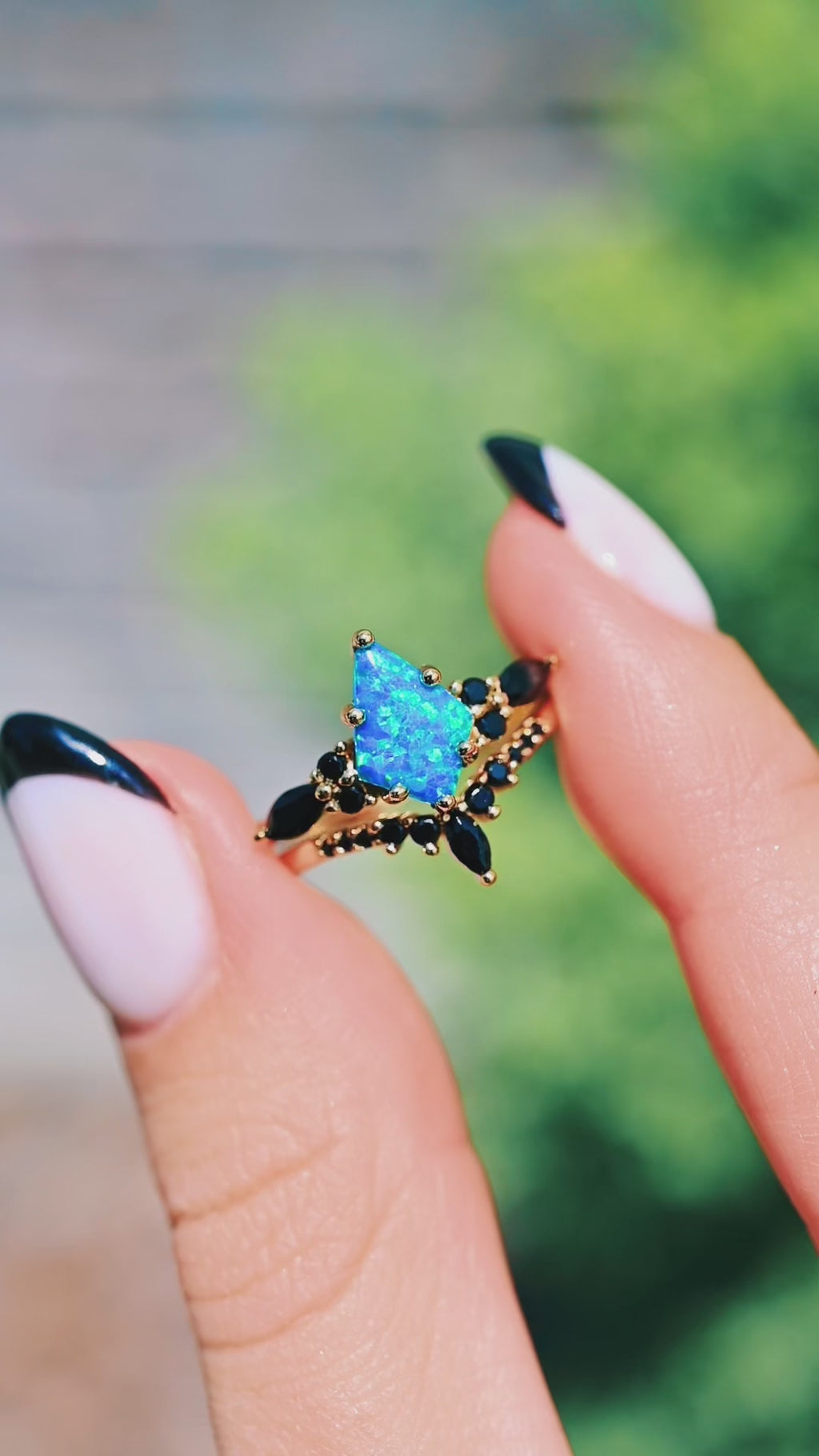 Immerse yourself in the enchanting allure of our Skye Blue Fire Opal & Black Onyx Ring (black diamond) Set, meticulously crafted to captivate the hearts of discerning women. Fashioned in luxurious 14K yellow gold vermeil, this engagement ring exudes a timeless elegance and sophistication.