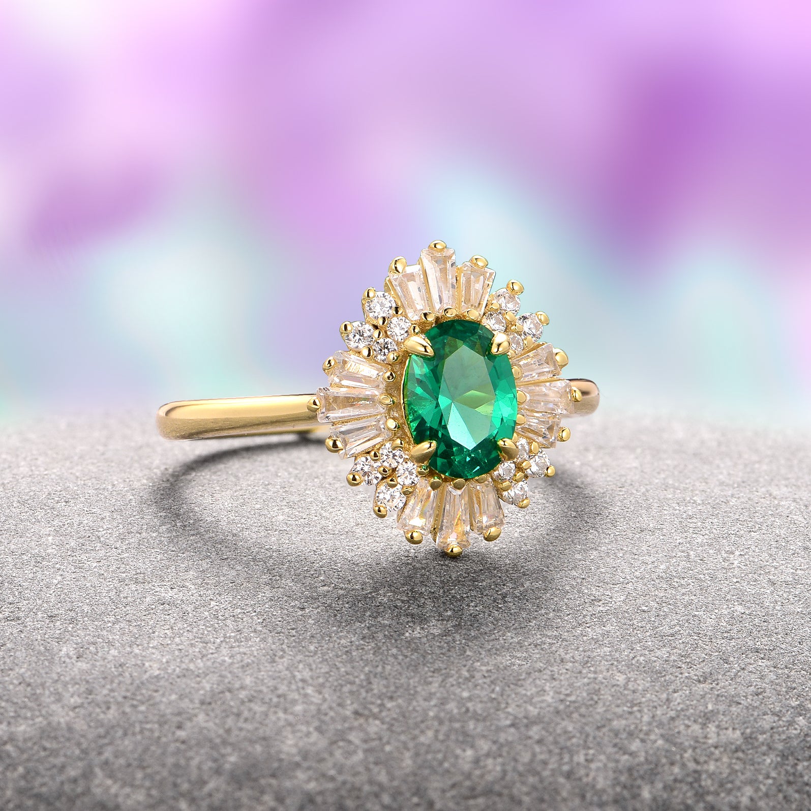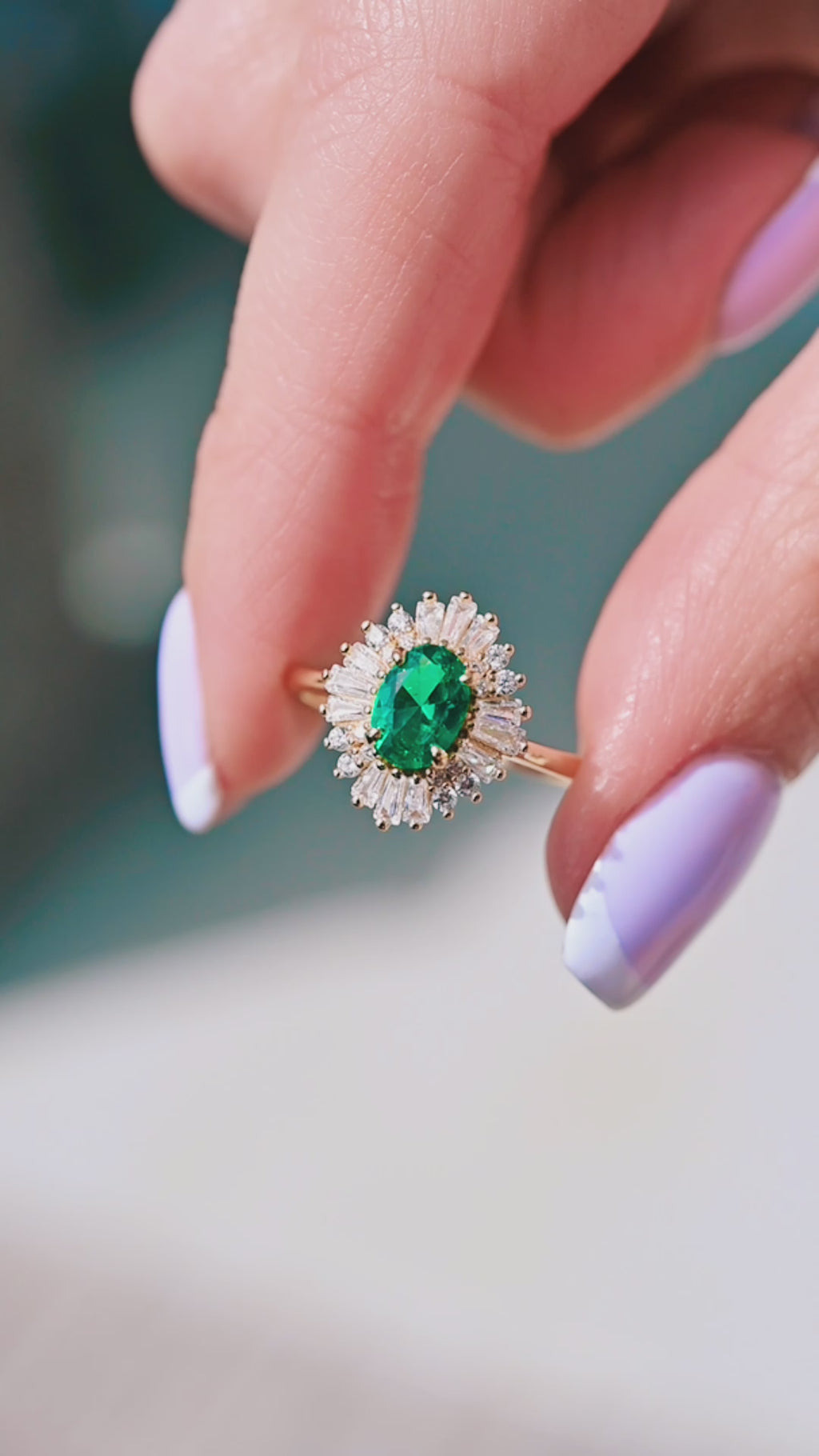 Celebrate timeless elegance with the Victoria Emerald Ring, a vintage-inspired treasure designed for the modern romantic. Drawing inspiration from the glamour of the 1920s Art Deco era, this piece radiates sophistication through its clean geometric lines and brilliant emerald-green centerpiece.