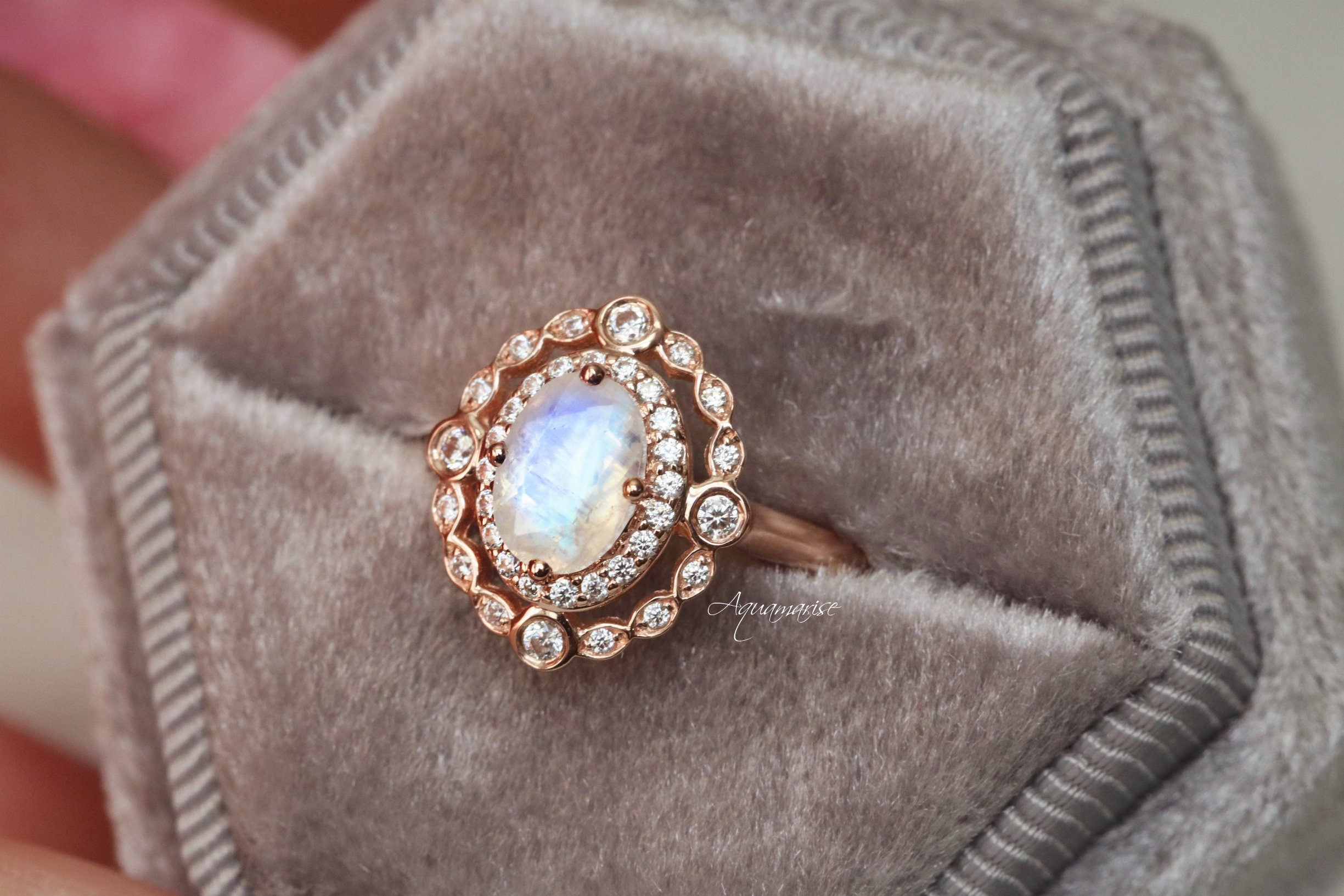 Handcrafted in your choice of 10K, 14K, or 18K solid rose gold, this moonstone engagement ring can also be custom made in yellow or white gold to perfectly match your style. Each ring is individually made to order, ensuring attention to every detail.