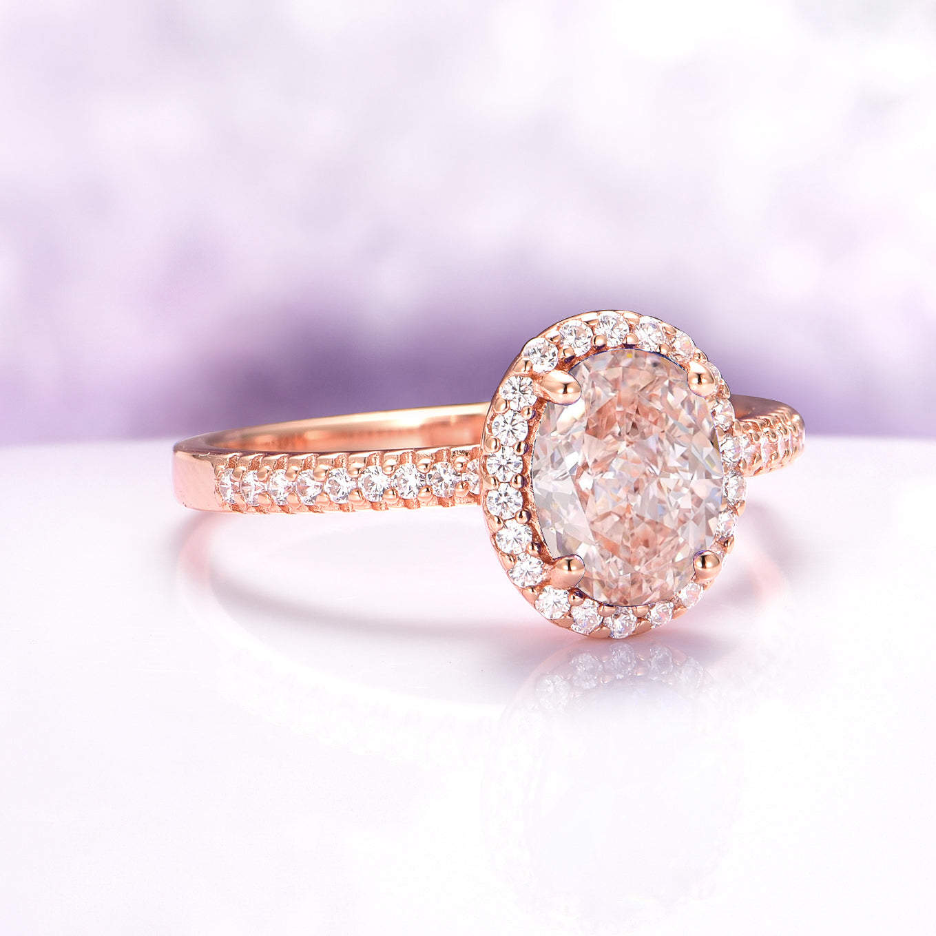 Delicate and radiant, the Iris Morganite Ring in 14K Solid Rose Gold features a peachy pink morganite center stone in a graceful halo setting, accented by sparkling moissanite. This non-traditional engagement ring blends timeless elegance with a romantic, ethereal glow.