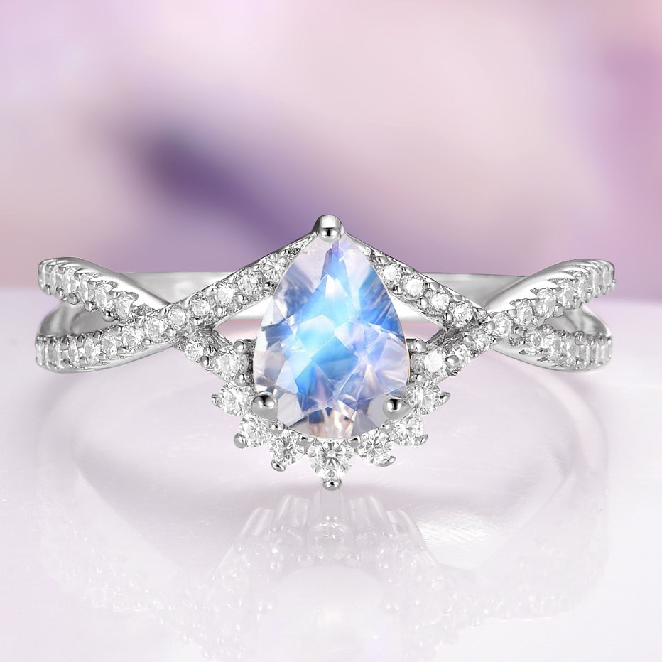 Graceful. Ethereal. Timeless. This Gorgeous Vintage Inspired Moonstone Ring captures the enchanting glow of the moon with every movement. Handcrafted in solid 14K white gold, the design features a luminous natural pear-cut moonstone held in a secure open basket setting with round prongs. The twisted vine band, adorned with sparkling accent stones, adds an elegant, organic flow that evokes vintage romance and celestial charm.