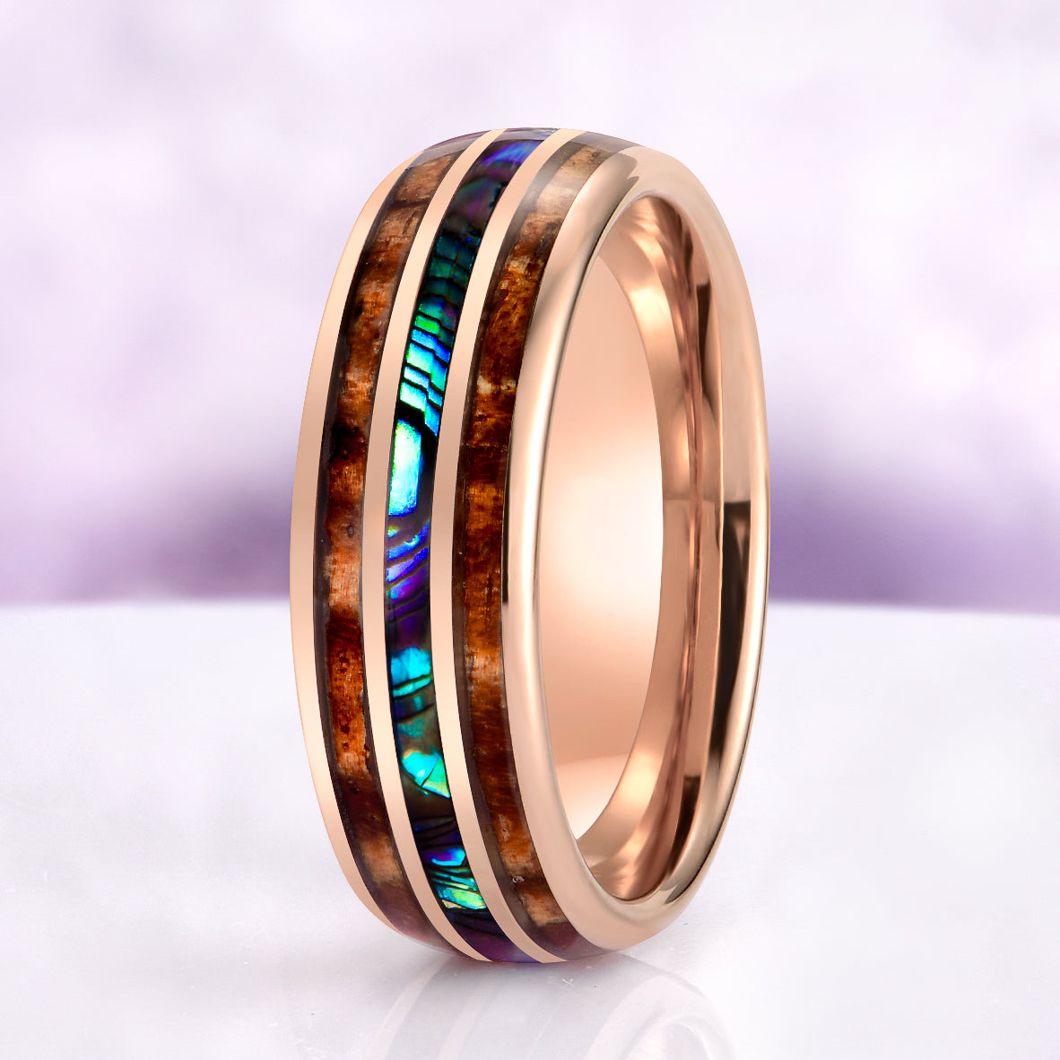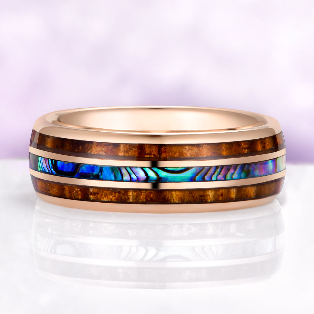 Combining the iridescent beauty of the ocean with the warmth of whiskey barrel wood, this abalone shell tungsten ring creates a bold and meaningful wedding band inspired by nature, craftsmanship, and the sea.