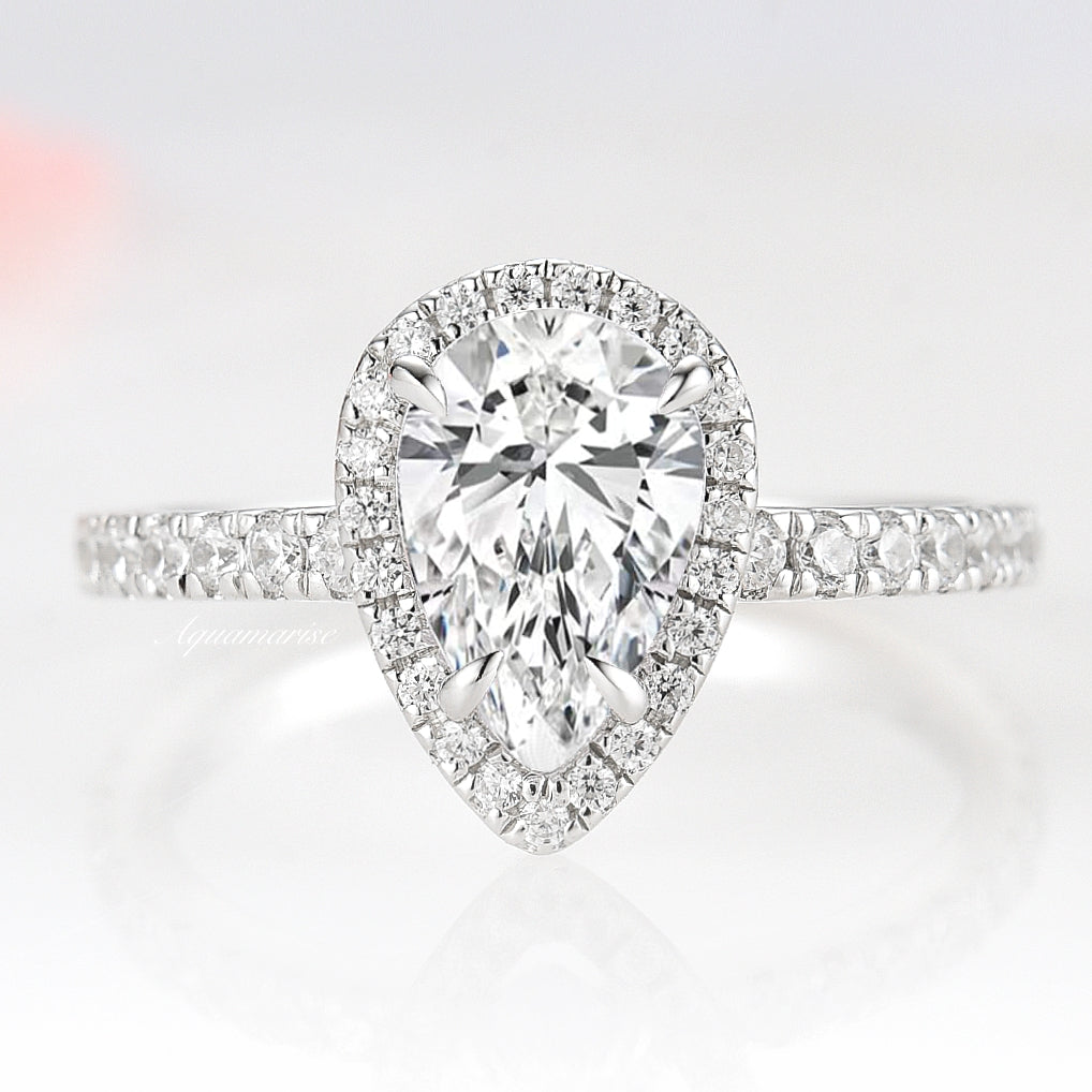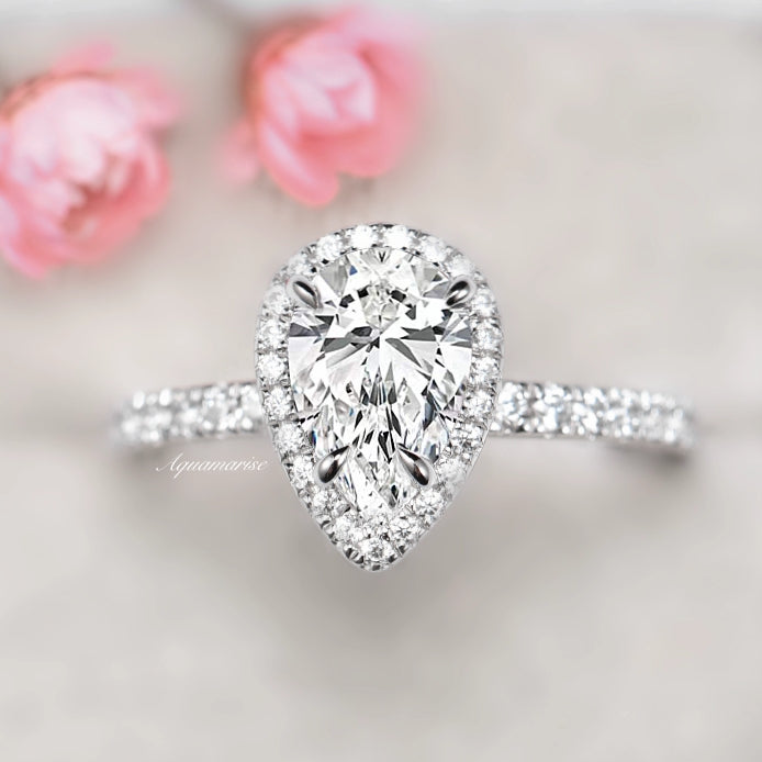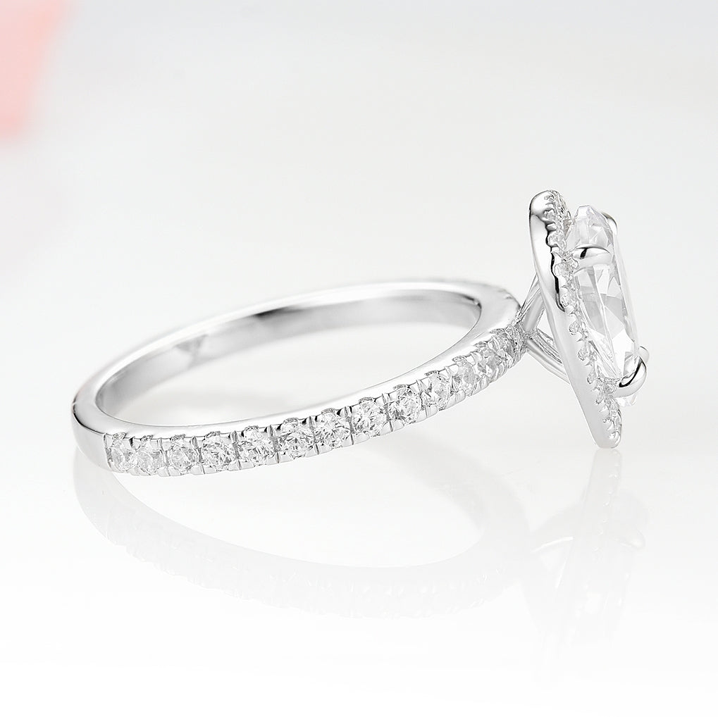 This sparkling halo setting features beautiful scalloped pavé moissanites around the center gem and adorn the band.