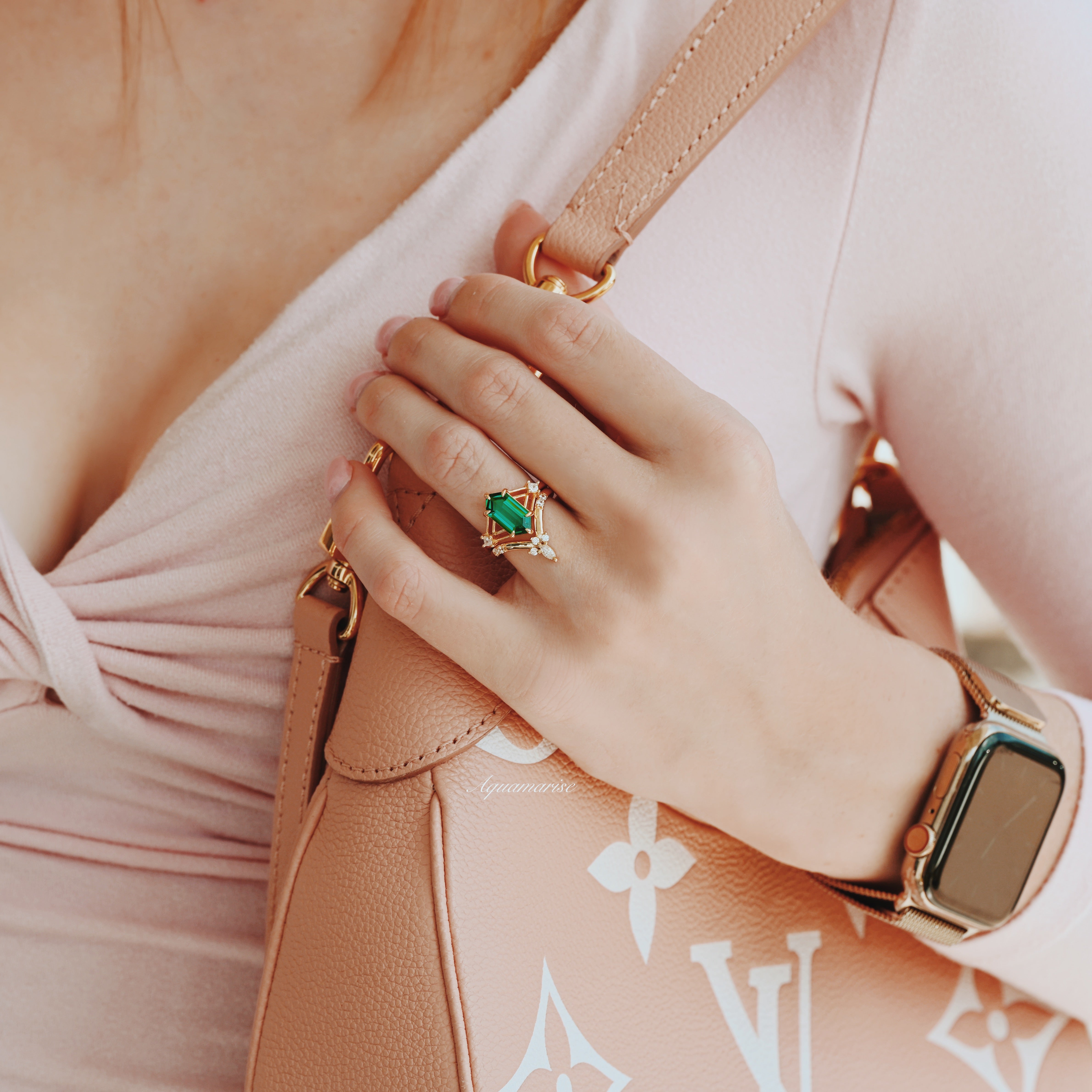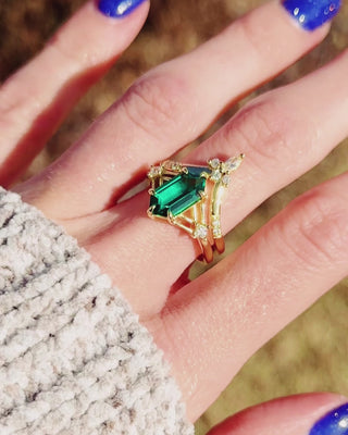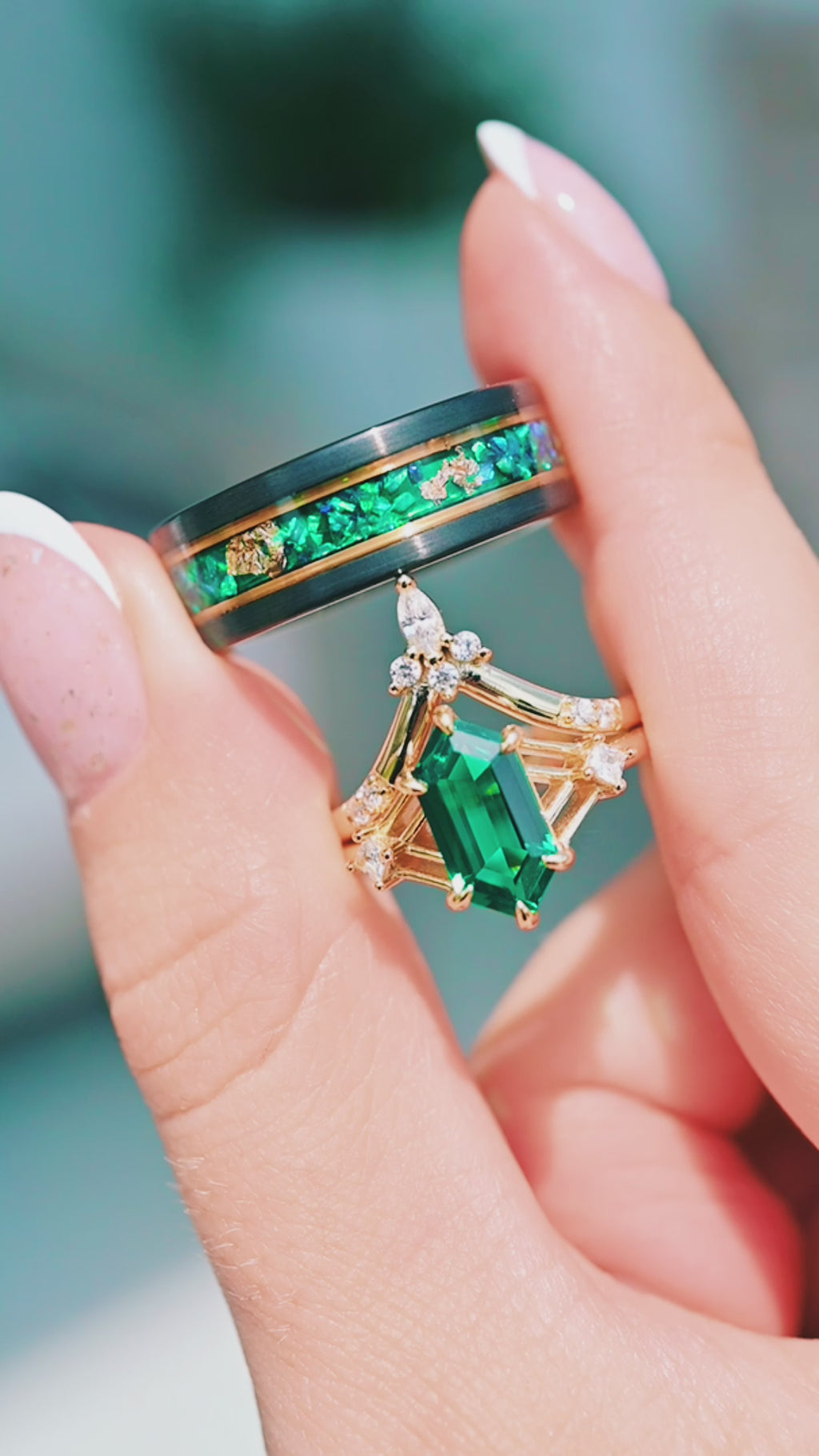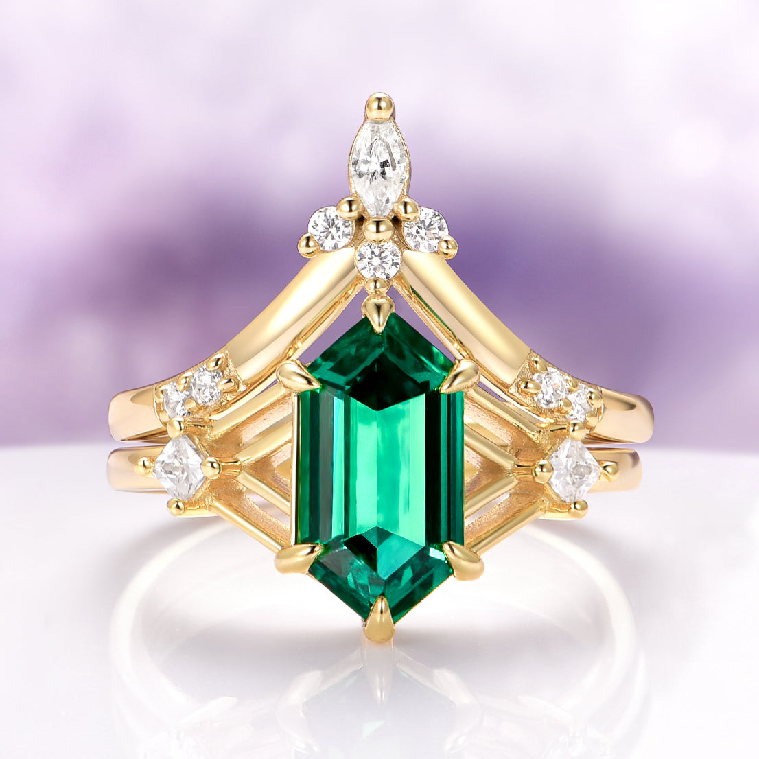 Bold, symbolic, and richly detailed, the Celtic Hexagon Emerald Ring Set in 14K solid yellow gold features a striking emerald center stone in a unique elongated hexagon cut. Surrounded by brilliant moissanite accents and paired with a delicately detailed matching band, this two-piece set draws inspiration from Celtic tradition and timeless love. Perfect for those who value heritage, vibrant color, and intricate craftsmanship, this set is a meaningful choice for engagements or milestone celebrations.