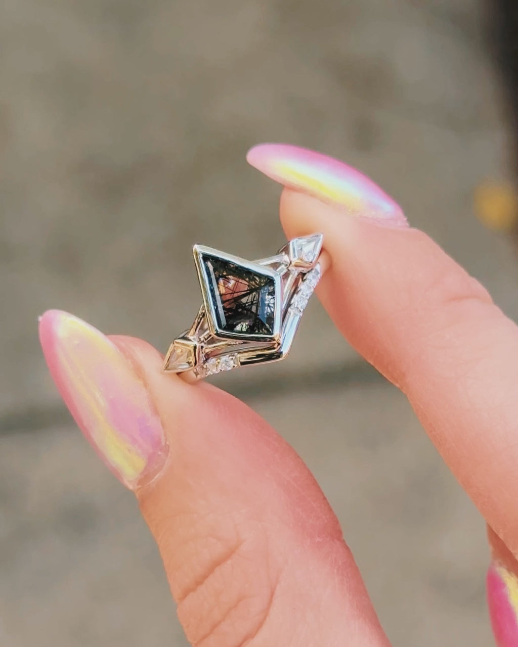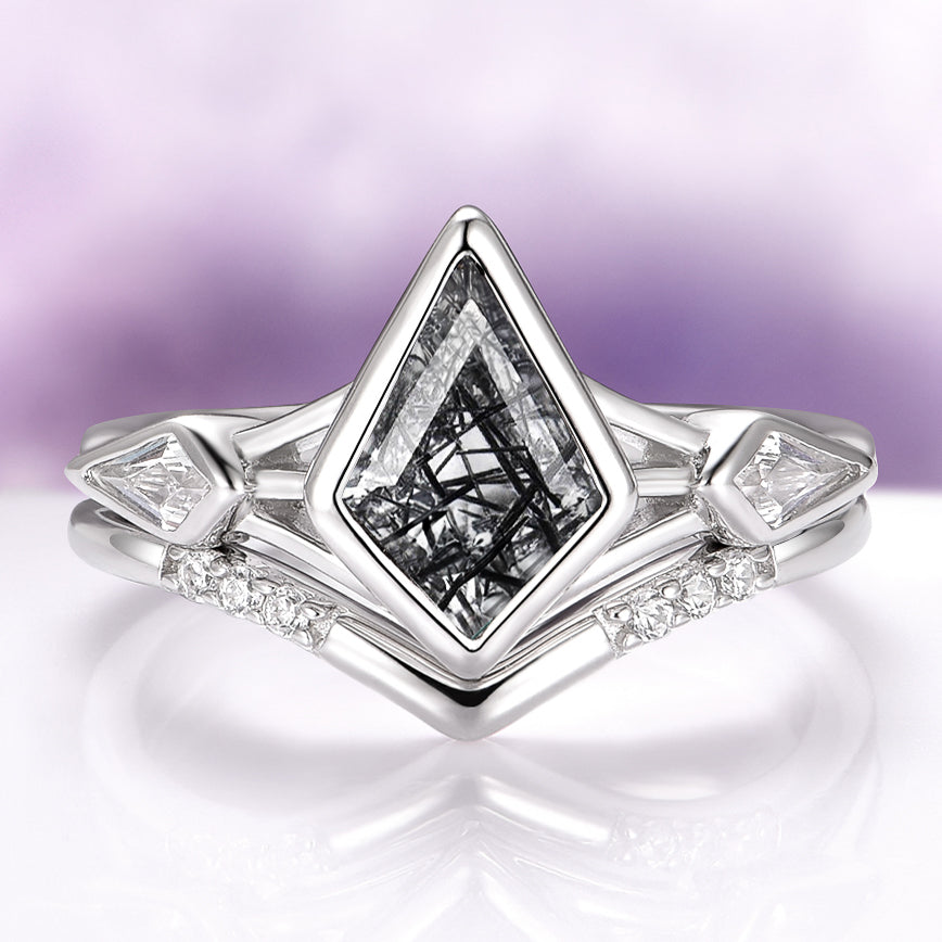 Kite Cut Black Rutilated Quartz Engagement Ring Set in 14K White Gold
