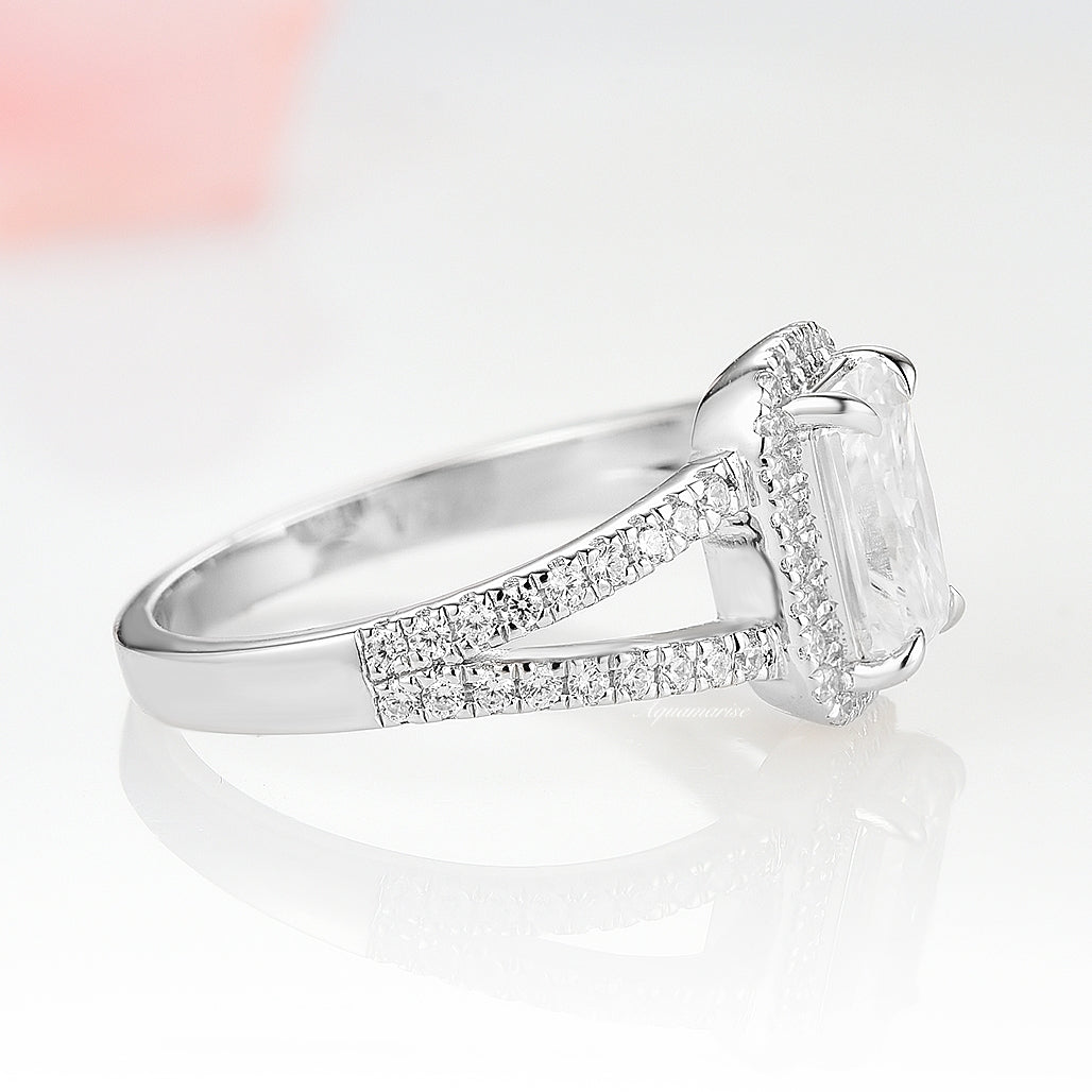 This classic engagement ring features shimmering scalloped pavé moissanites that extend half of the way around the ring. A split shank setting makes this ring truly spectacular.