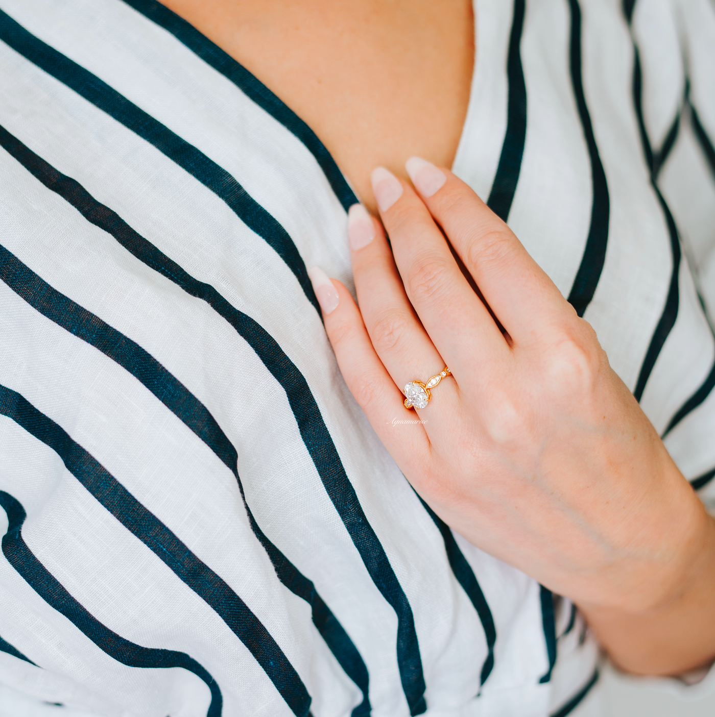 This vintage inspired engagement ring features shimmering scalloped pavé moissanites that extend half of the way around the ring. A moissanite-encrusted gallery and milgrain makes this ring truly spectacular.