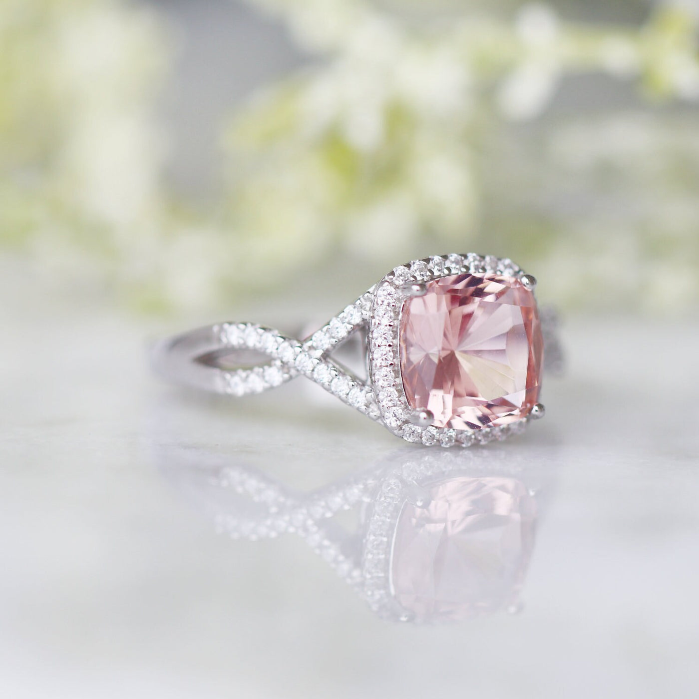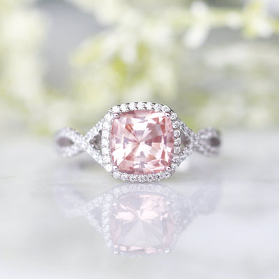 This romantic blush pink ring captures the essence of timeless love and modern elegance. The cushion-cut simulated morganite sparkles with soft feminine hues, beautifully complemented by the infinity twisted vine band crafted in solid sterling silver with a radiant rhodium finish.