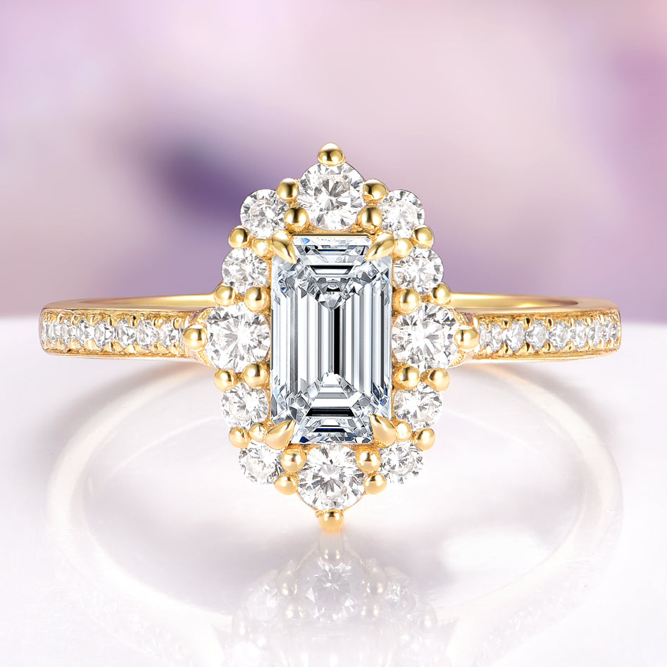 Vintage-Inspired Emerald Cut Moissanite Engagement Ring in 14K Yellow Gold
