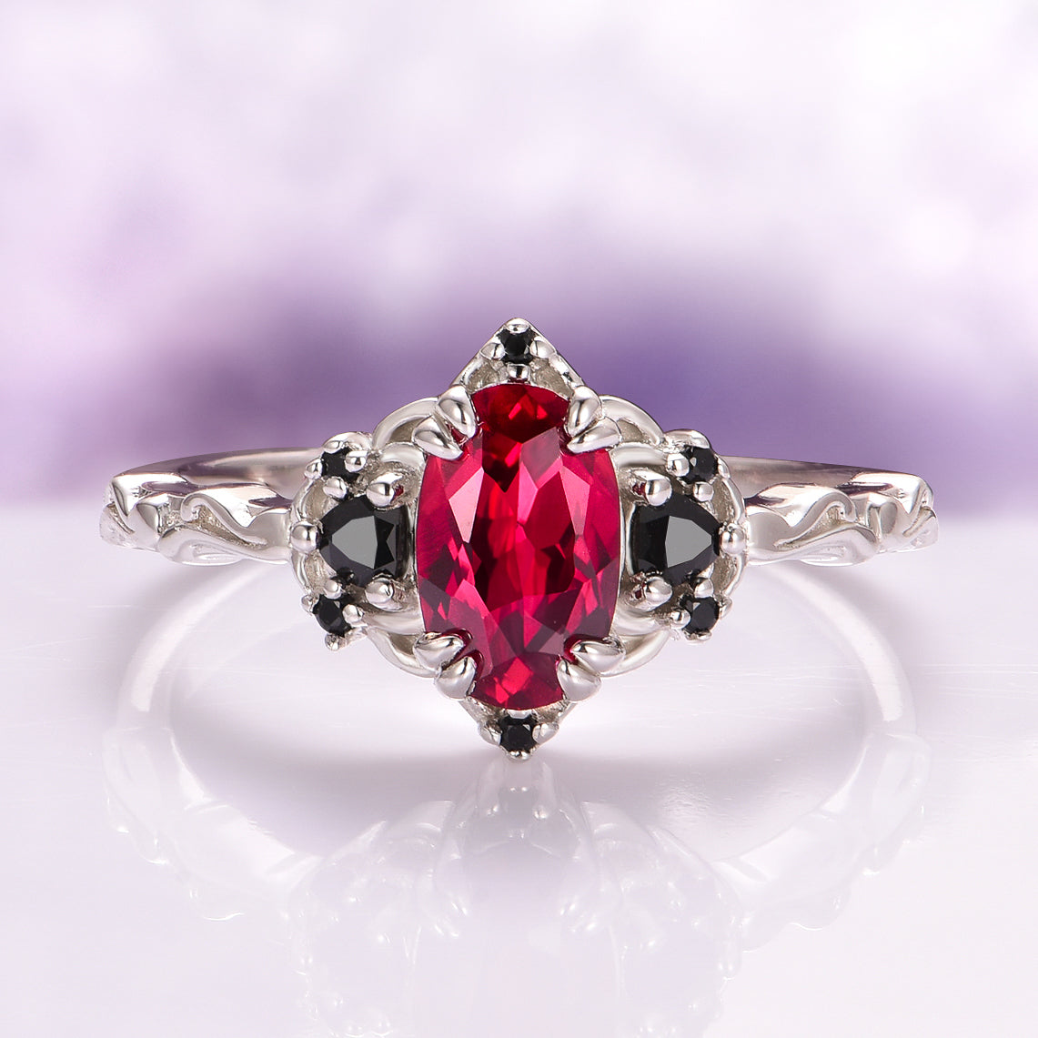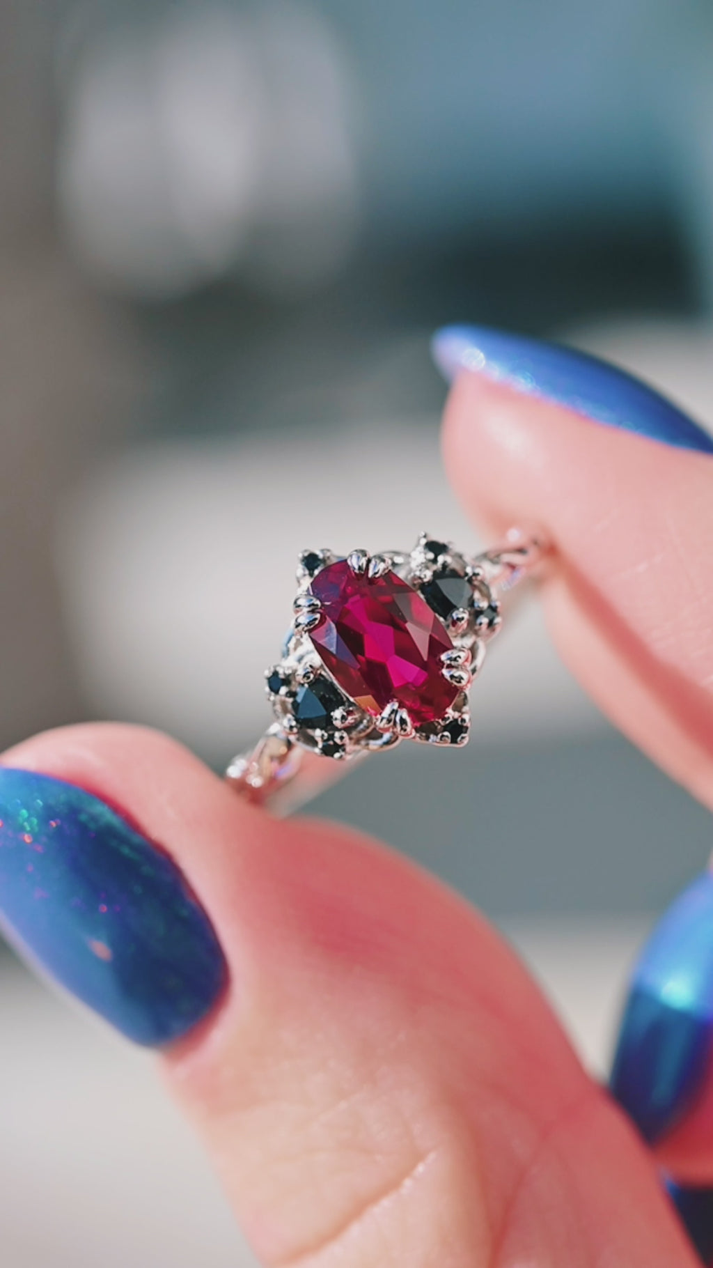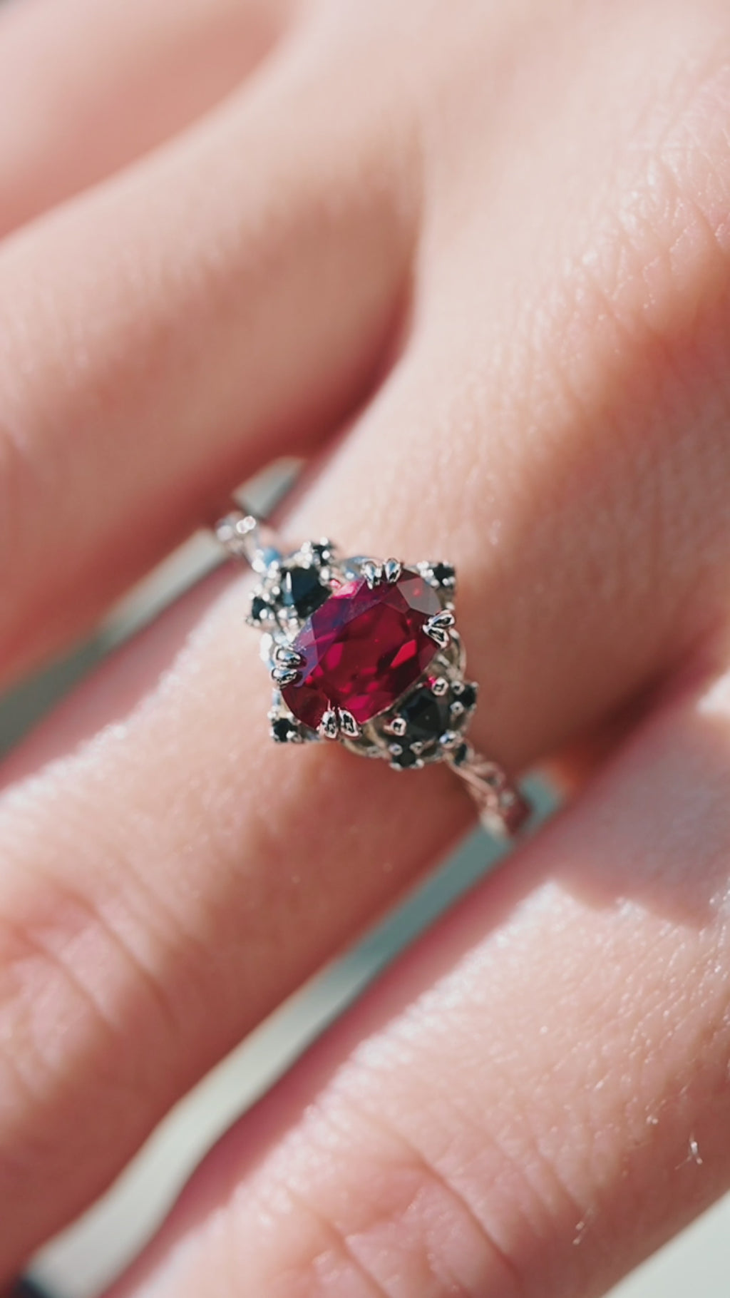 ► Ruby is celebrated for its intense pinkish red hue and exceptional clarity, symbolizing passion, strength, and enduring love. Paired with deep black onyx accents, cherished for their grounding and protective qualities, this ring evokes a bold sense of romance and resilience. Ideal for lovers of fantasy-inspired jewelry, fairycore engagement rings, or meaningful gemstone gifts, the Esme Ring offers an unforgettable expression of love.