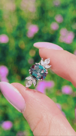 Capture timeless romance with this enchanting Oval Alexandrite Vintage Flower Engagement Ring. Designed to resemble a lotus blossom, this ring features an oval center stone complemented by three marquise-cut side stones, forming a delicate floral motif that symbolizes purity, love, and new beginnings.