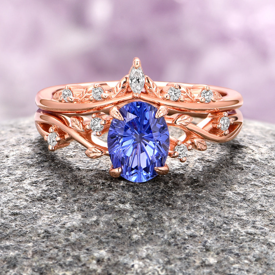 Unveil the magic with the Fantasy Fireworks Purple Sapphire Fairy Leaf Ring Set, a mesmerizing two-piece design that exudes elegance and whimsy. Crafted from 14K solid rose gold, this enchanting ring set features a stunning oval-cut purple sapphire at its center, radiating a celestial brilliance reminiscent of twilight fireworks.