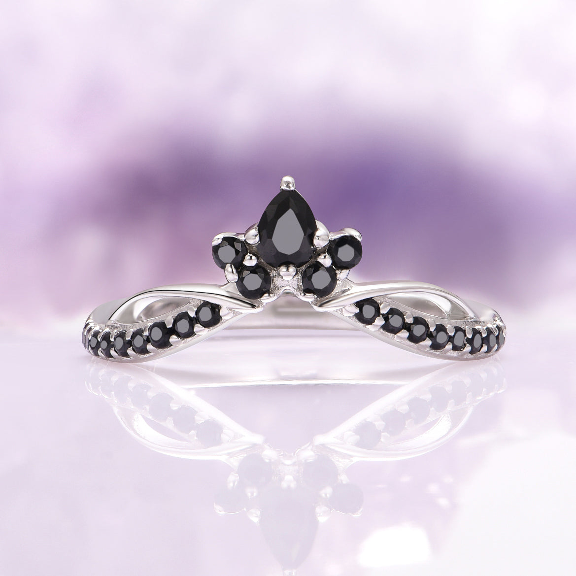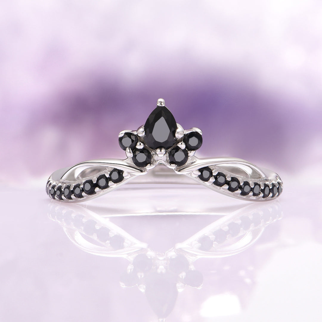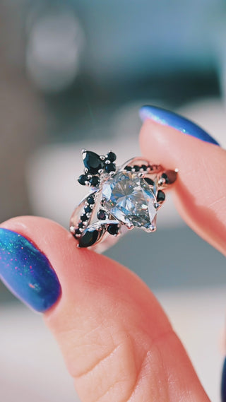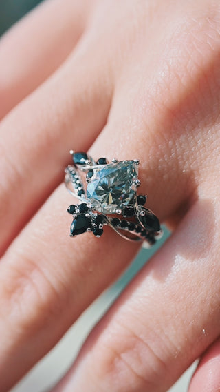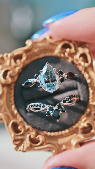 ► Embrace the magic of dark romance with our Feyre Ring Set, a striking two-piece design inspired by royalty and fantasy realms. Crafted in 14K solid white gold, this enchanting set features a bold 2-carat pear-cut gray moissanite as the center stone, framed by shimmering natural black onyx side stones for a moody, mysterious elegance.