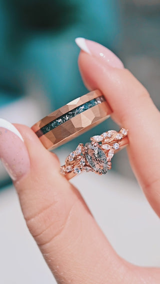 ►The men’s band, crafted from durable tungsten carbide, showcases a striking meteorite inlay, representing strength and eternity. Together, they form the perfect matching wedding band set for couples who embrace the magic of the stars.