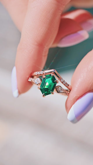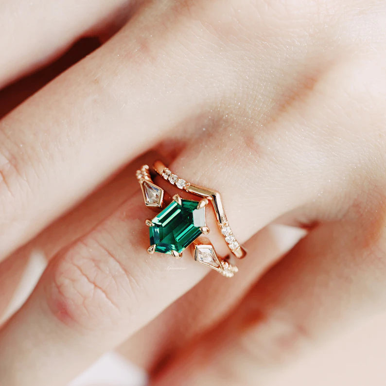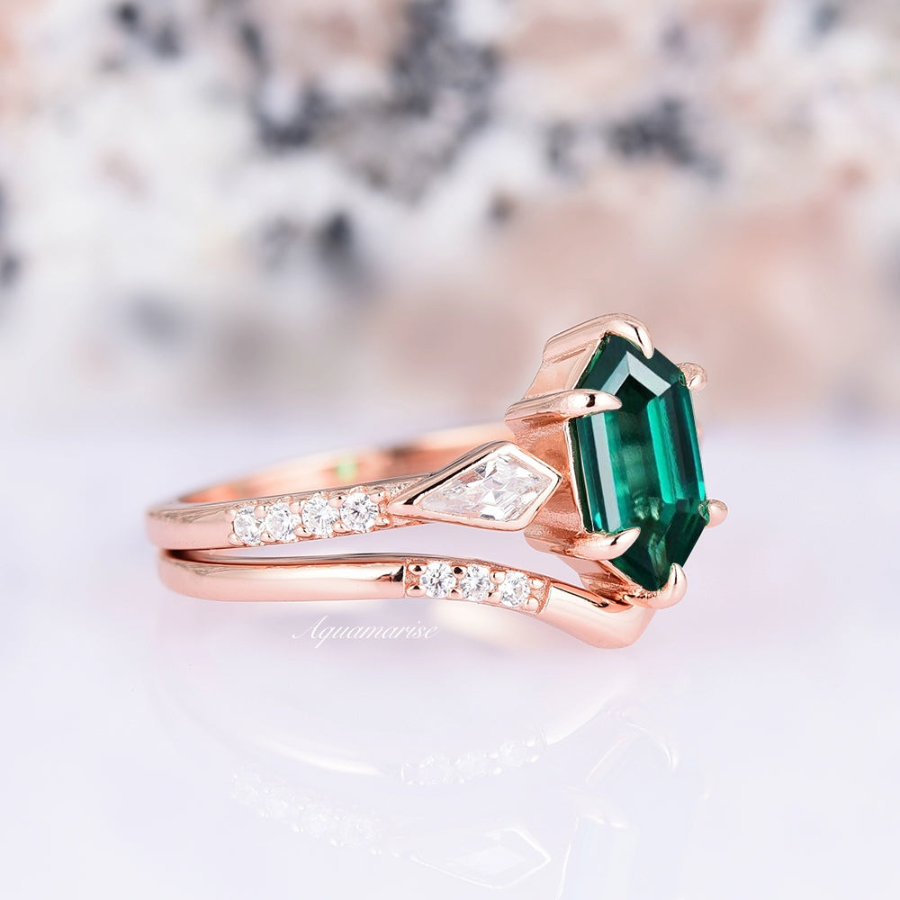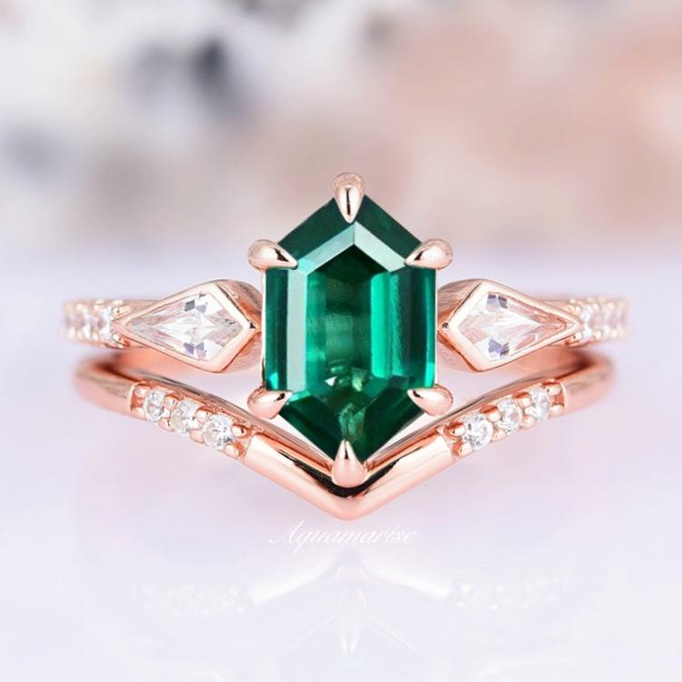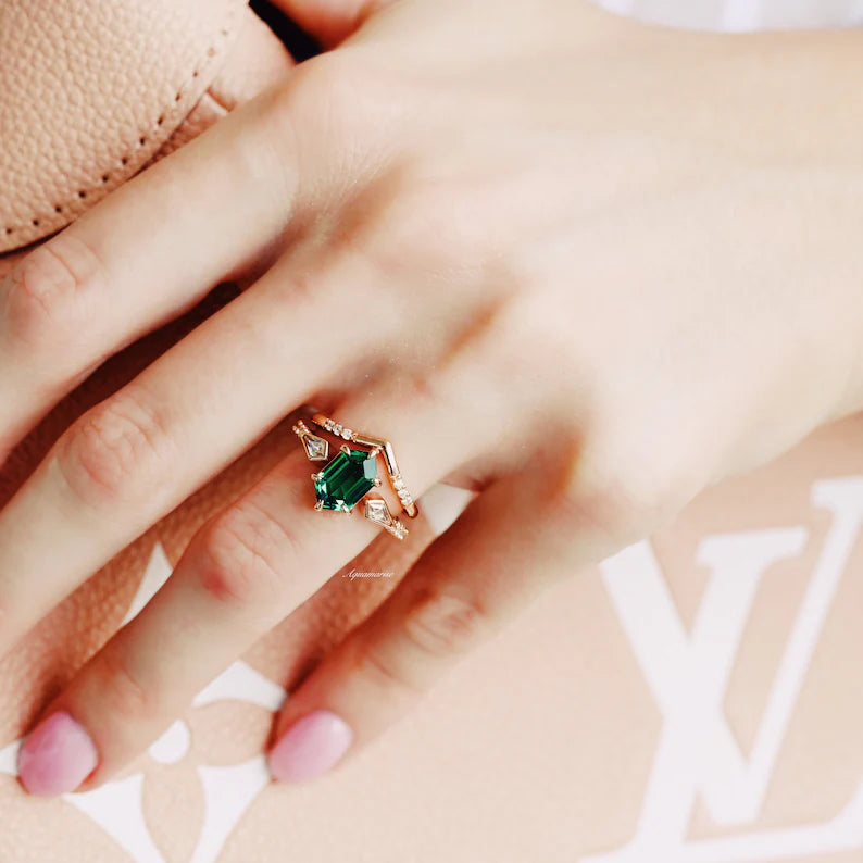 Exquisite Hexagon Emerald Ring Set, a dazzling testament to love and timeless elegance. Crafted with meticulous attention to detail, this set features a stunning Hexagon-cut emerald gemstone cradled in a setting of lustrous 14K rose gold vermeil, creating a truly captivating piece of jewelry.