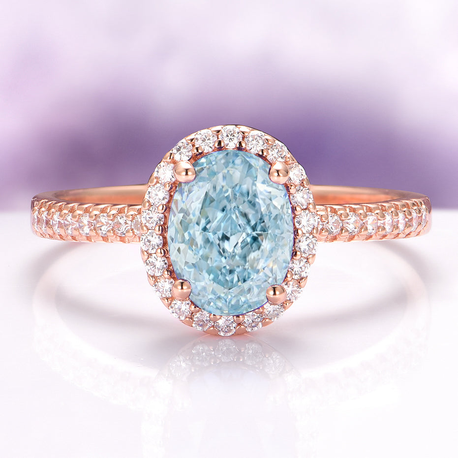 Delicate and radiant, the Iris Aquamarine Ring in 14K Solid Rose Gold features a serene natural aquamarine center stone in a graceful halo setting, accented by sparkling moissanite or natural diamonds. This non-traditional engagement ring blends timeless elegance with a fresh, ocean-inspired touch.
