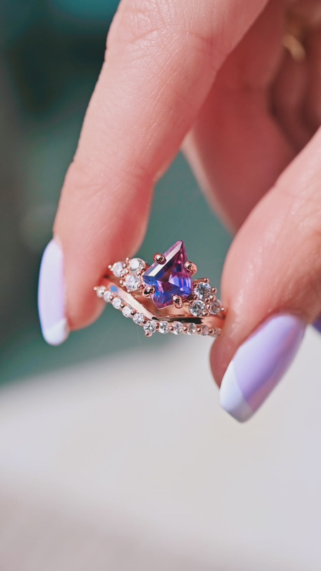 The lab-grown Alexandrite center stone features a rare and magical color-changing effect—shifting from green in natural daylight to purple under incandescent or candlelight. This unique transformation makes every glance at your ring feel new and extraordinary. A kite-shaped cut adds a modern, geometric twist to its vintage appeal, creating a bold look that captures light from every angle.