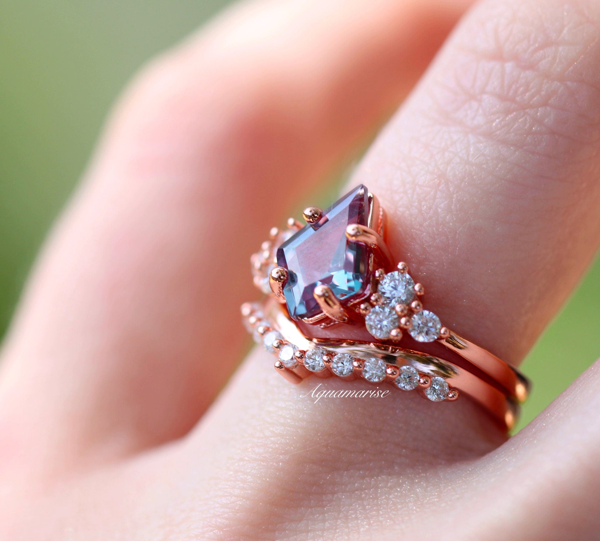 Make a timeless statement with this gorgeous vintage-inspired Alexandrite ring set, crafted in 14K rose gold over 925 solid sterling silver. Designed with elegance and simplicity in mind, this minimalist ring set is perfect as an engagement ring, promise ring, birthstone ring, or statement piece. Its lightweight, hypoallergenic design ensures all-day comfort while showcasing a truly enchanting gemstone.