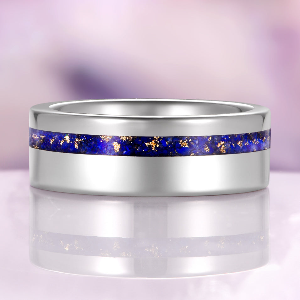 A striking fusion of modern design and natural beauty. This men’s tungsten wedding band features a vibrant offset inlay of natural lapis lazuli accented with shimmering gold foil, creating a bold yet refined contrast against the high-polished silver finish.