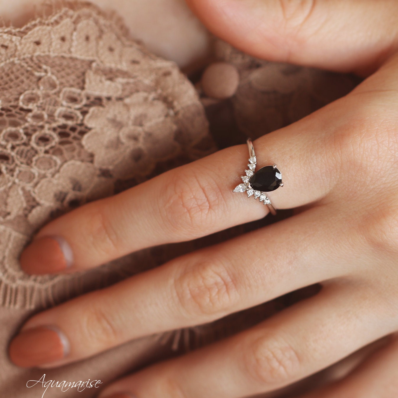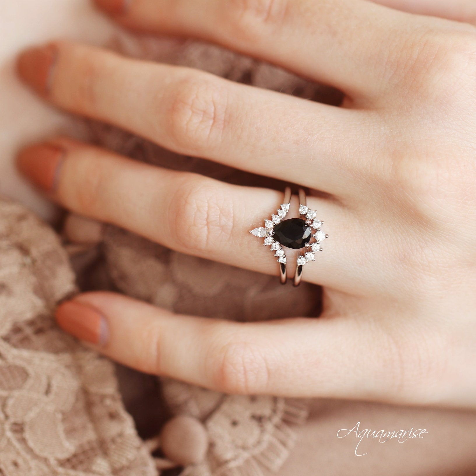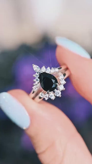 This captivating Black Onyx Ring Set showcases a striking teardrop-cut natural black onyx center stone, beautifully set in solid white gold for a sleek, enduring finish. Known as a stone of strength and protection, black onyx is believed to promote resilience, grounding, and inner confidence, making it especially meaningful as a symbol of love and commitment. Bold yet refined, this ring offers timeless elegance for those seeking a non-traditional engagement ring or a promise ring with mystique.