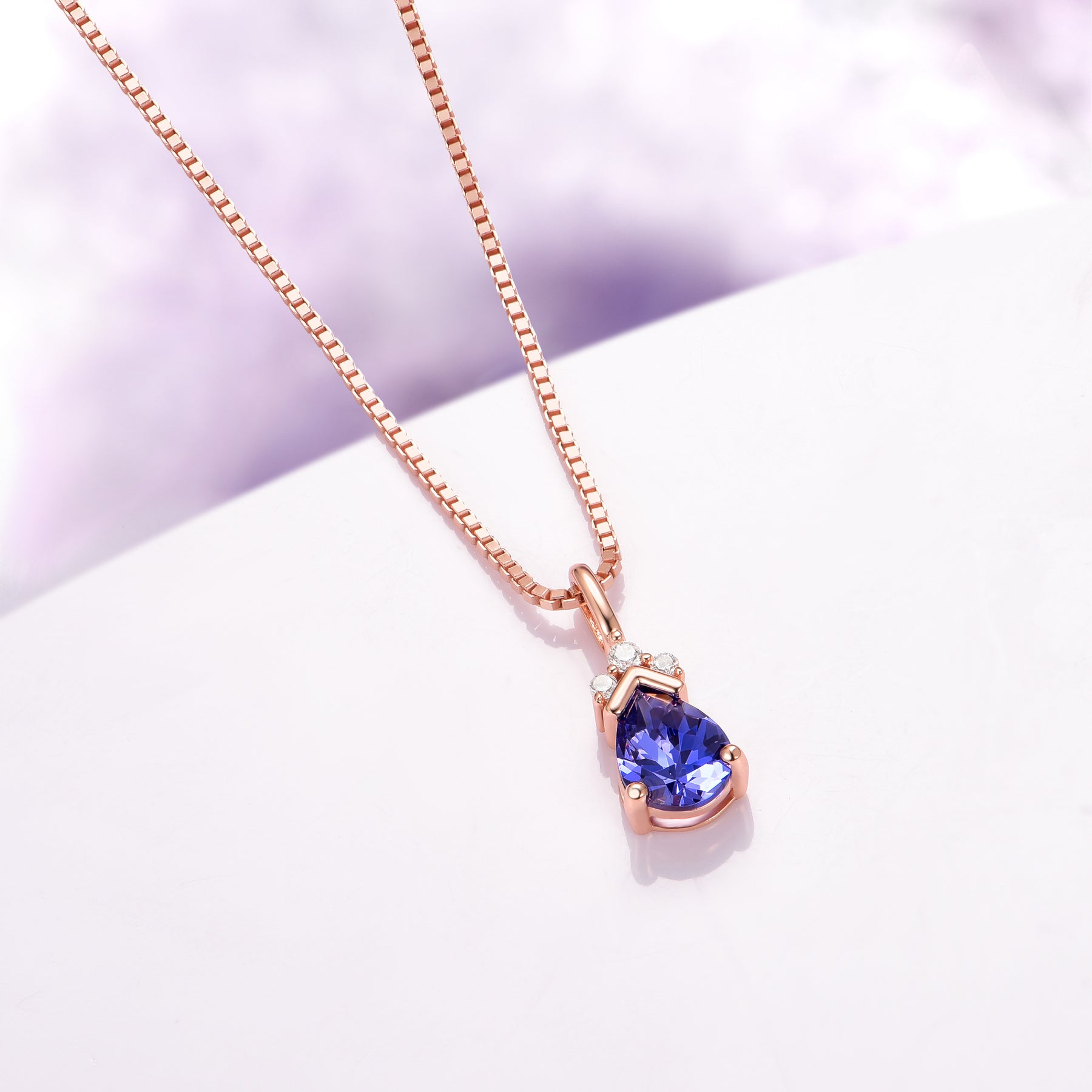 ►The pendant features a gracefully sculpted teardrop-shaped lab-created Tanzanite gemstone, renowned for its enchanting violet-blue hue, exuding a sense of refinement and mystique. Encased within the warmth of the 14K Rose Gold Vermeil setting, the necklace radiates a soft, rosy glow, adding a touch of subtle luxury to any ensemble.