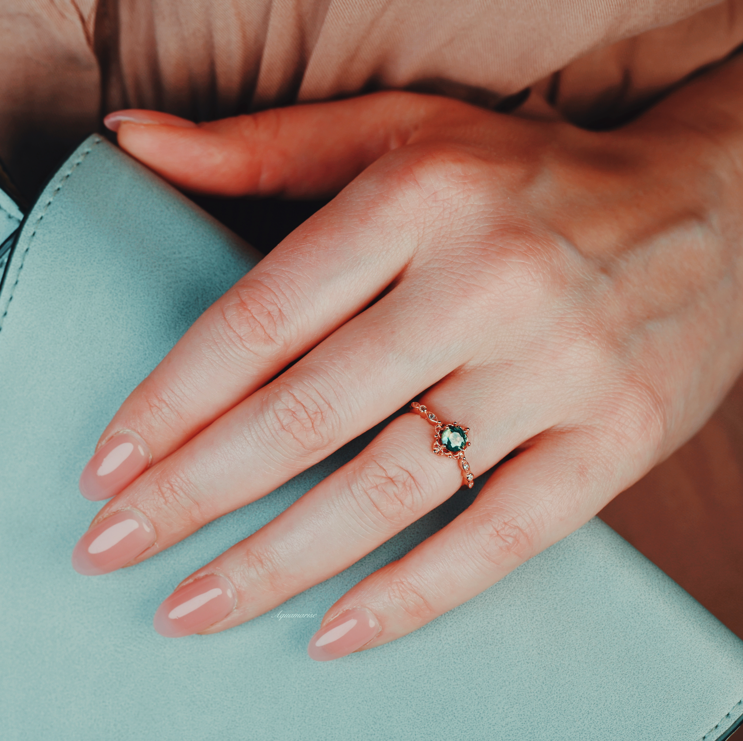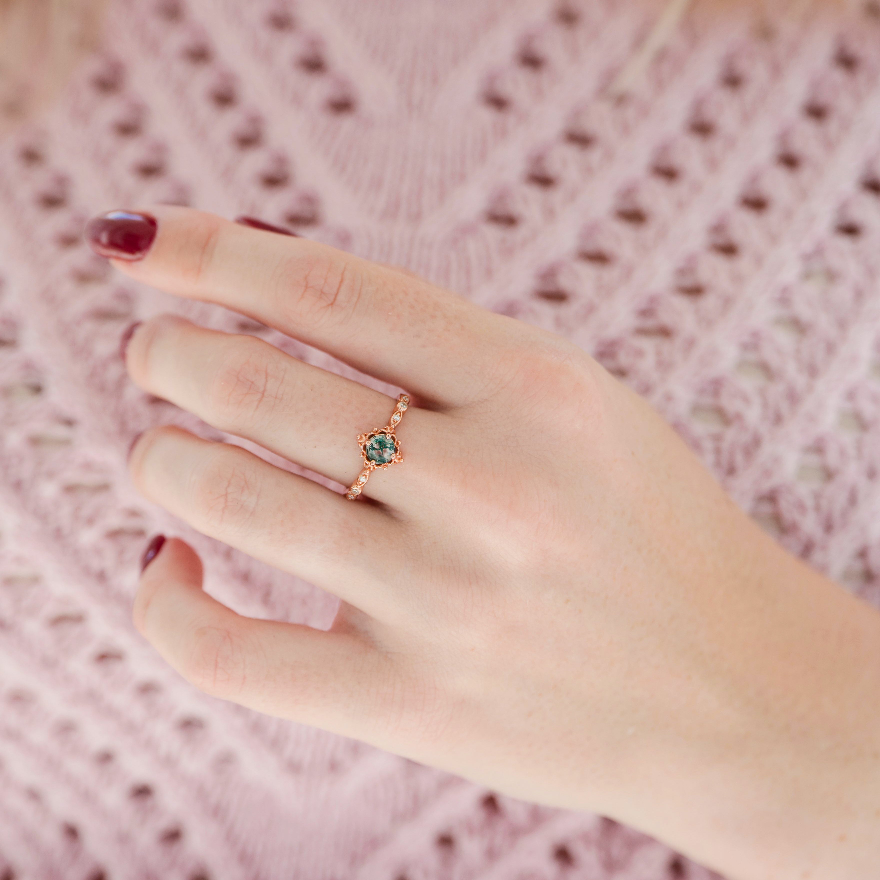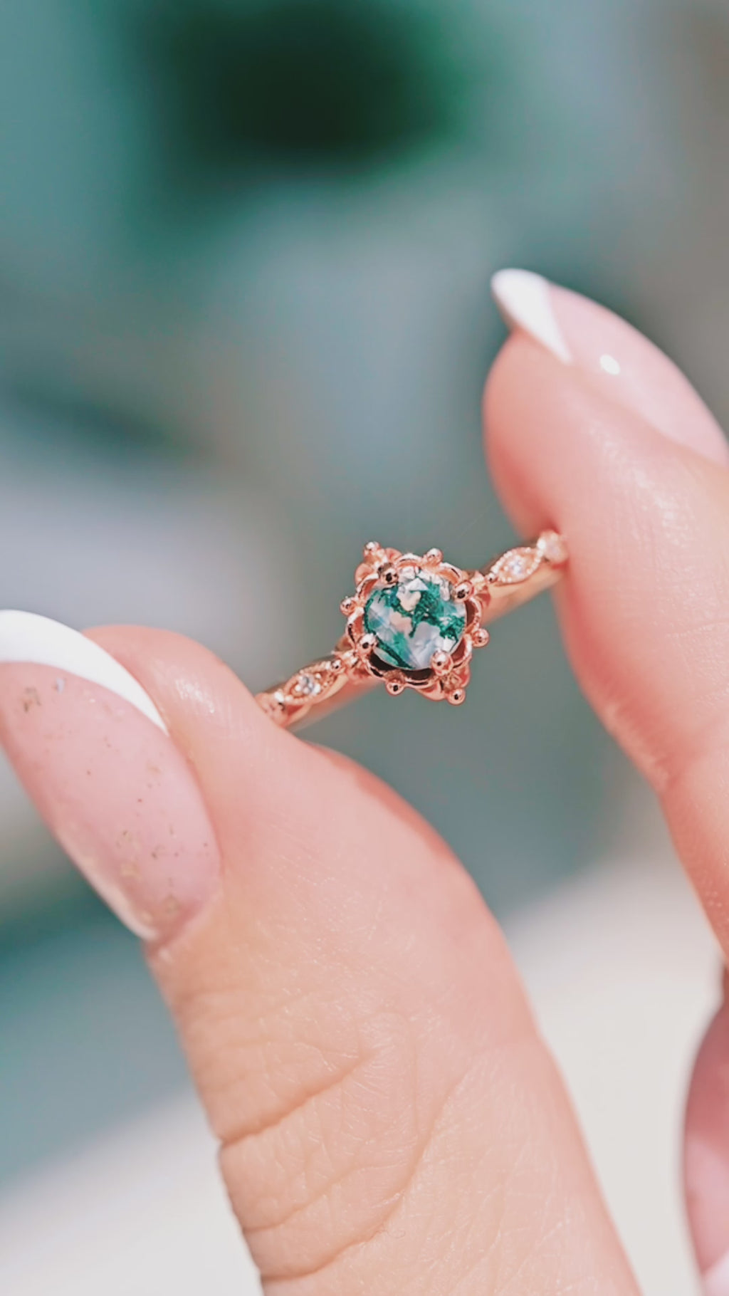 Vintage Green Moss Agate Engagement Ring in 14K Rose Gold Vermeil