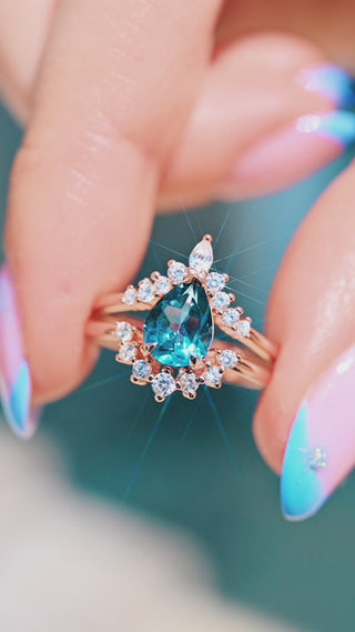 This elegant ring set features a striking teardrop-shaped natural London Blue Topaz, framed by shimmering simulated diamond accents for added brilliance. Crafted in solid 925 sterling silver and plated in rich 14K rose gold vermeil, this piece combines timeless charm with a modern romantic touch. Perfect as a non-traditional engagement ring, promise ring, or meaningful gift for someone born in November.