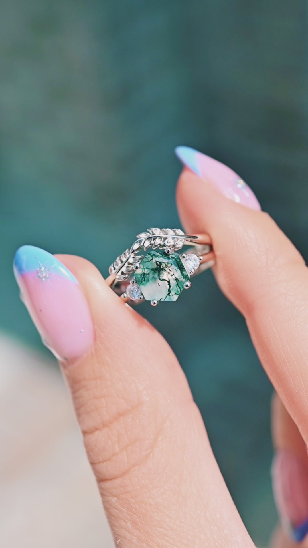 Moss Agate Leaf Ring Set in 925 Sterling Silver – Nature Inspired Hexagon Engagement Ring – Unique Promise Ring – Anniversary Gift for Her